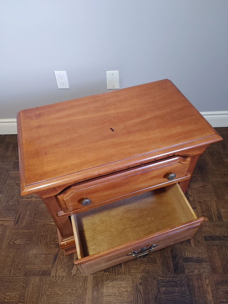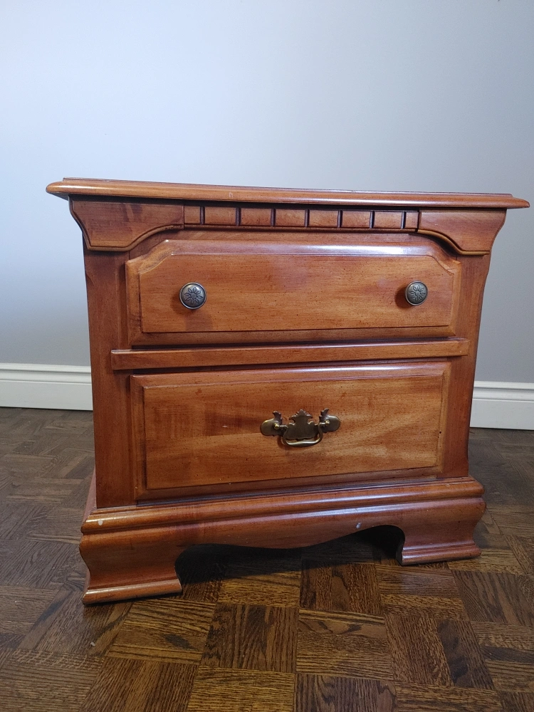 Bedside table. Brown, solid wood (not plyboard). Glossy finish with one black paint mark (shown in photos). Dependable and handsome!