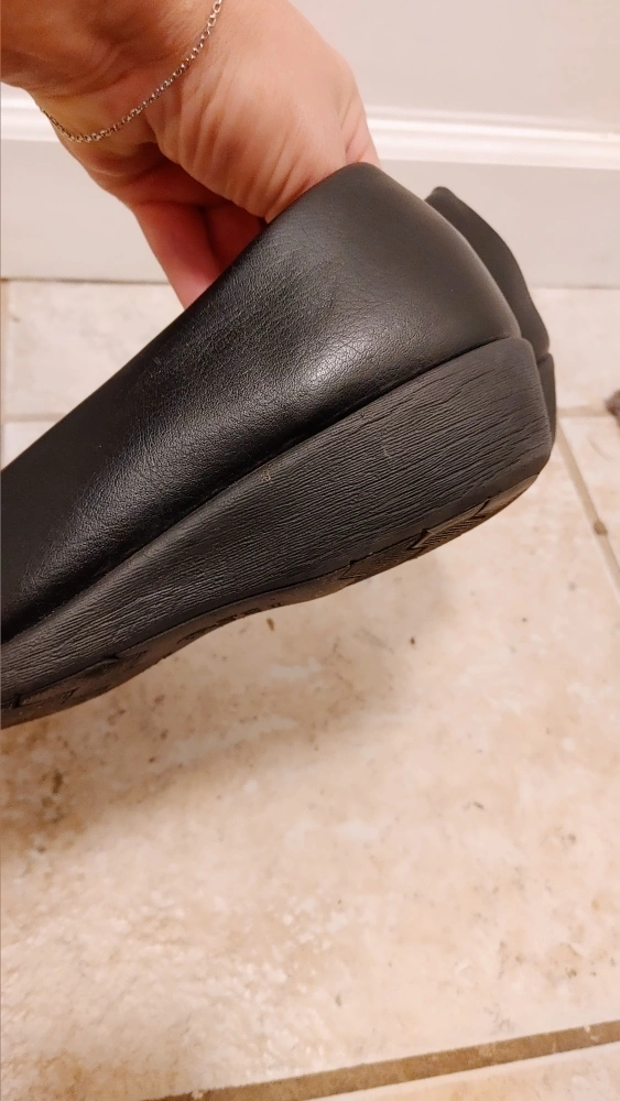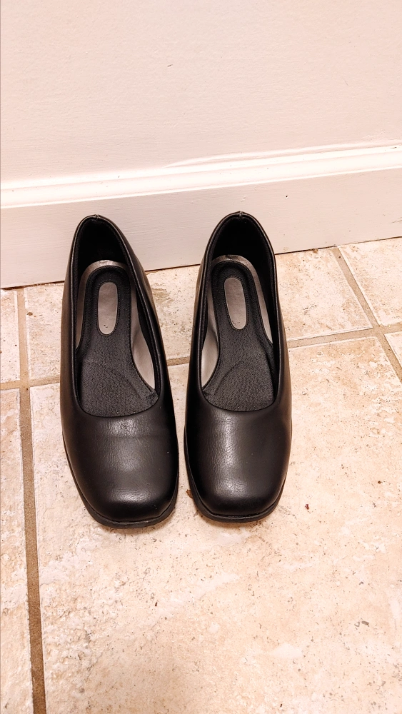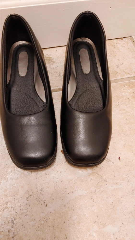 Comfortable black slip-on wedge heels. These shoes feature a durable sole and a classic design. Perfect for everyday wear or professional settings!
