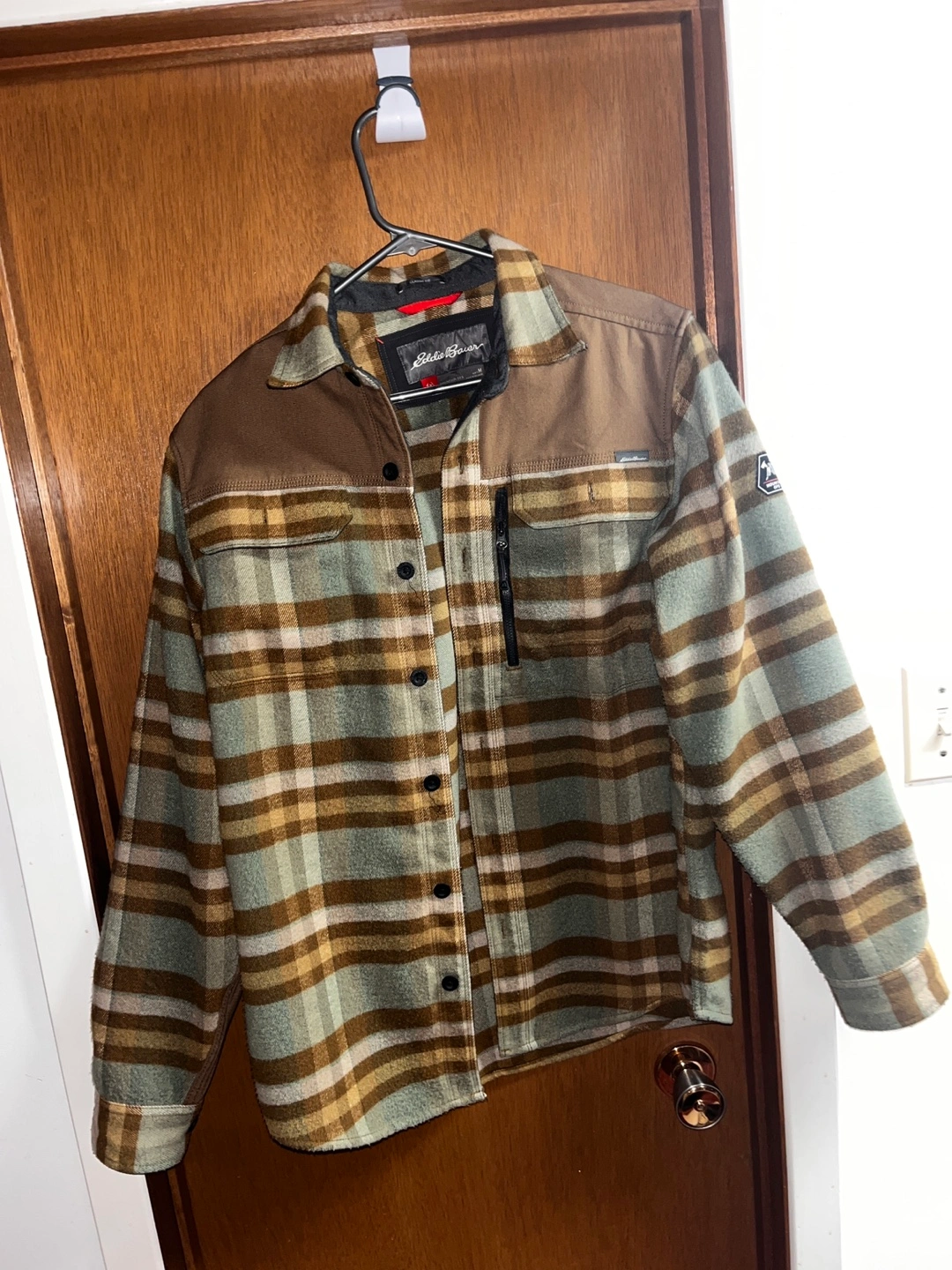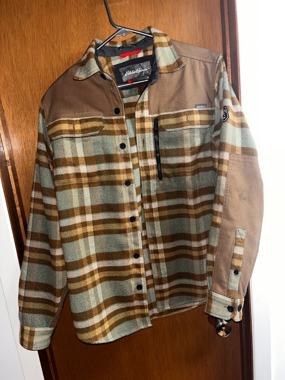 Men's Eddie Bauer flannel shirt jacket. Size Medium. Classic fit. Plaid pattern. Brown and green colours. Features corduroy accents and zippered chest pocket.OBO