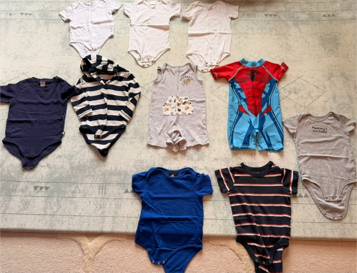 Selling a lot of baby onesies in various sizes and designs! Includes brands like Adidas (blue), Carter's (grey 'Mommy's best friend'), and a Marvel Spiderman swim suit (18-24M). There's also a Harry Potter onesie. A great mix for your little one!