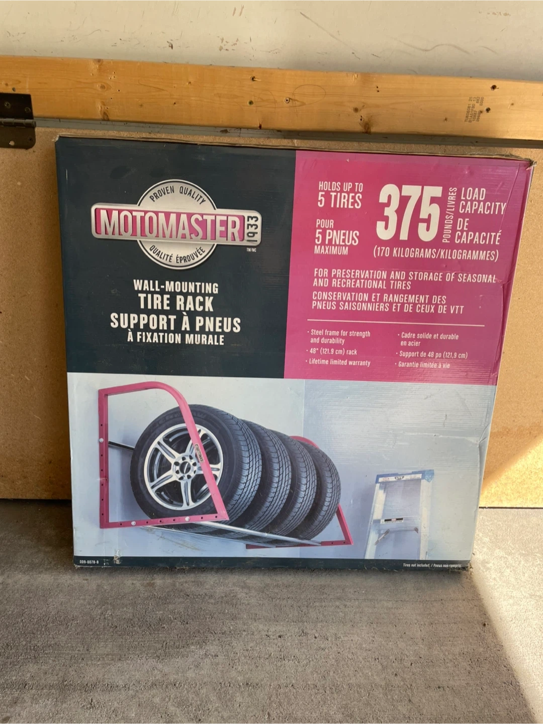 MotoMaster Wall-Mounting Tire Rack! It's designed to hold up to 5 tires, making it perfect for seasonal and recreational tire storage. The rack features a durable steel frame for strength and a 48" (121.9 cm) rack length. Brand new, box never opened.