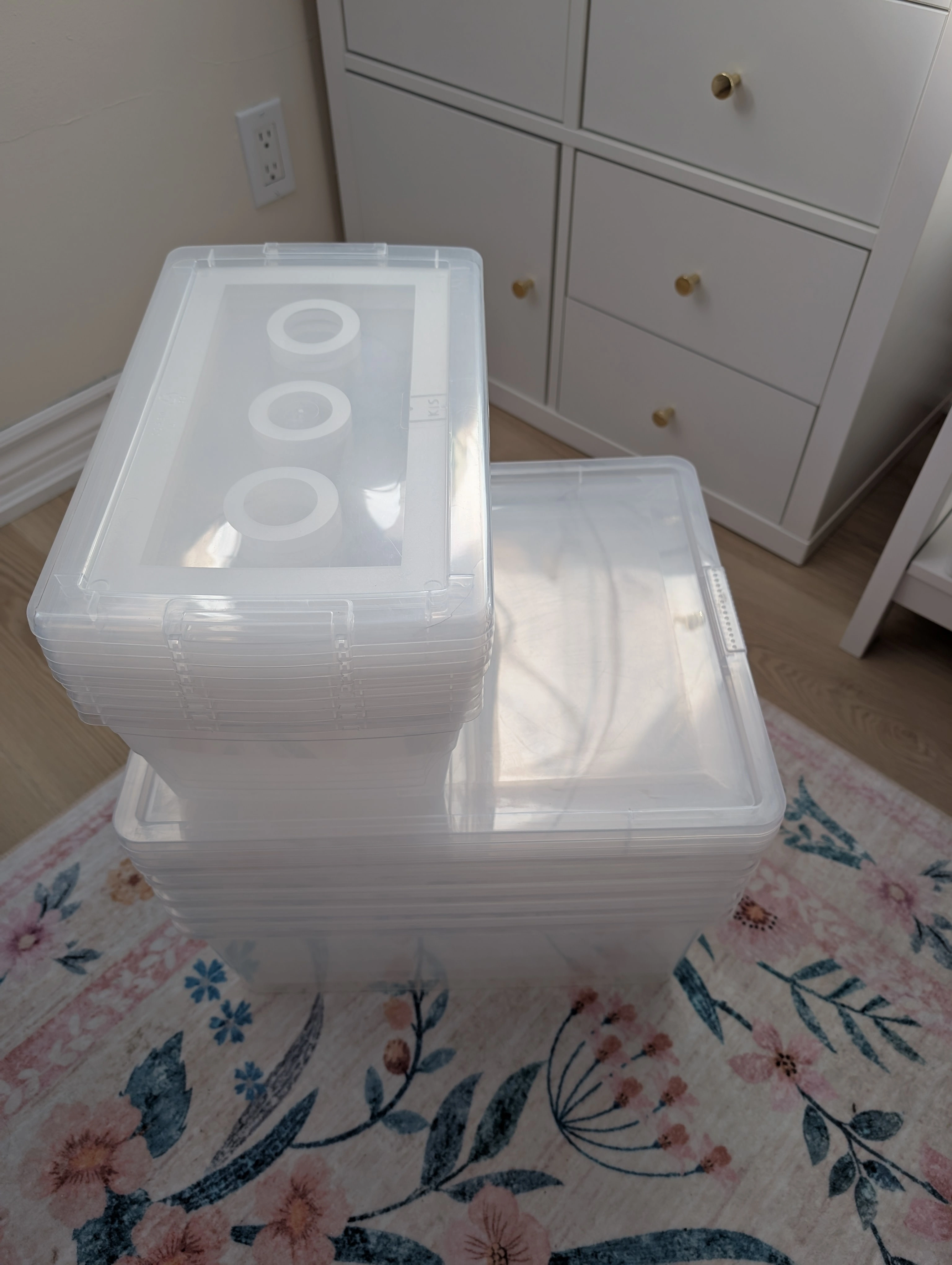 Selling a set of clear plastic storage boxes with lids. Great for organizing your home!