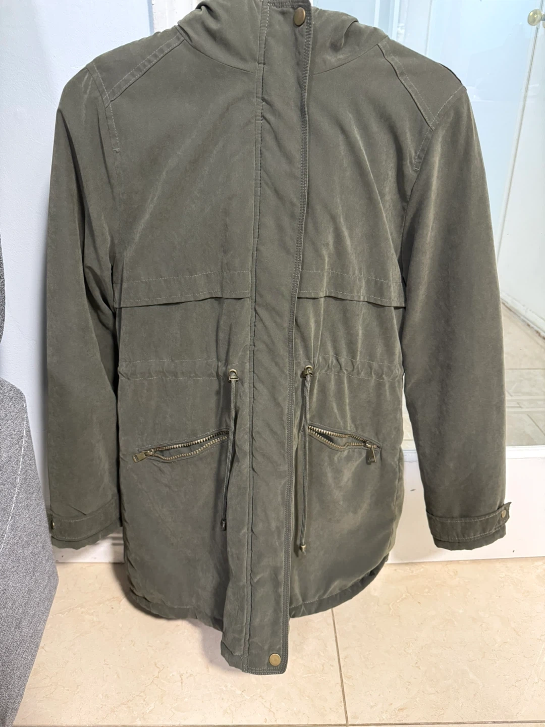 Olive green anorak parka jacket with a faux fur-lined hood. It features a drawstring waist and zippered pockets. This jacket is size XS.