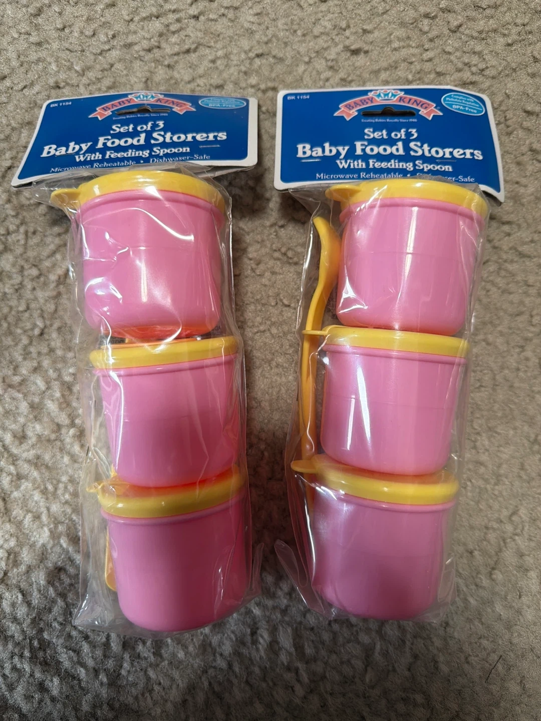 I have a set of 3 Baby King food storers, still new in packaging! They come with a feeding spoon and are microwave and dishwasher-safe. Perfect for storing baby food!