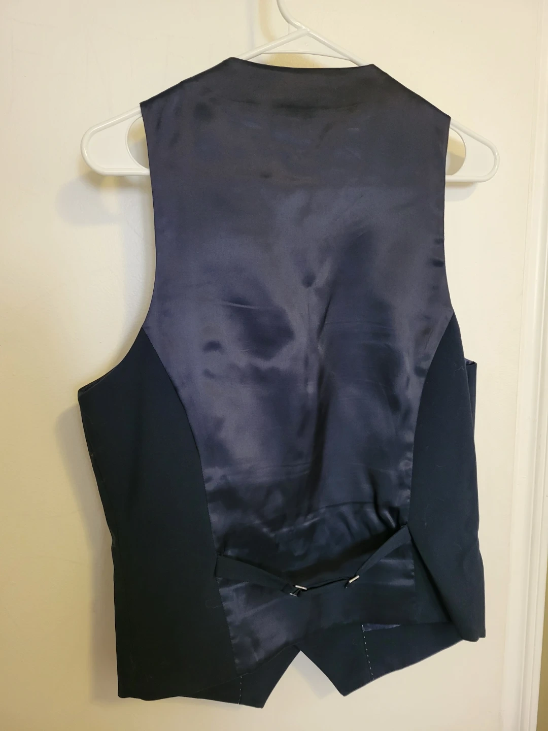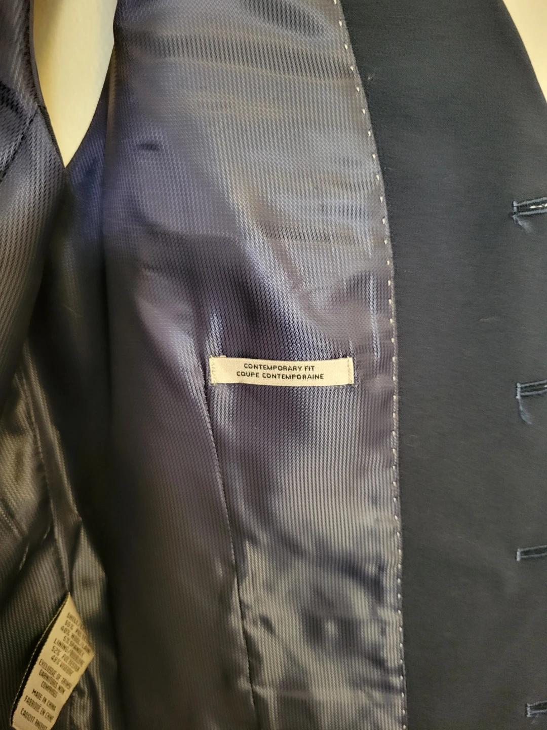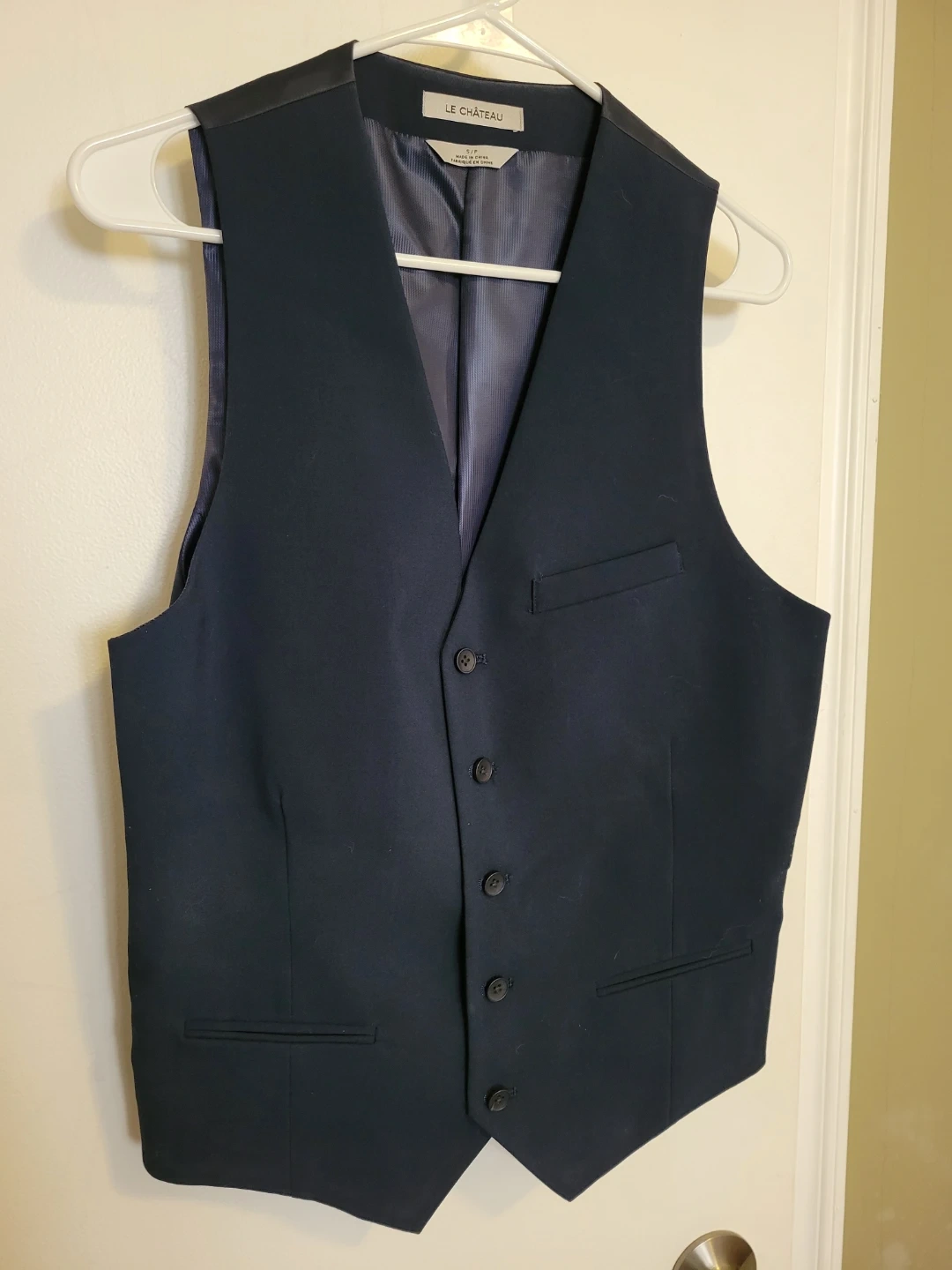 This is a LE CHÂTEAU navy vest. It's a contemporary fit with a wool blend. The lining is made of polyester and spandex.
