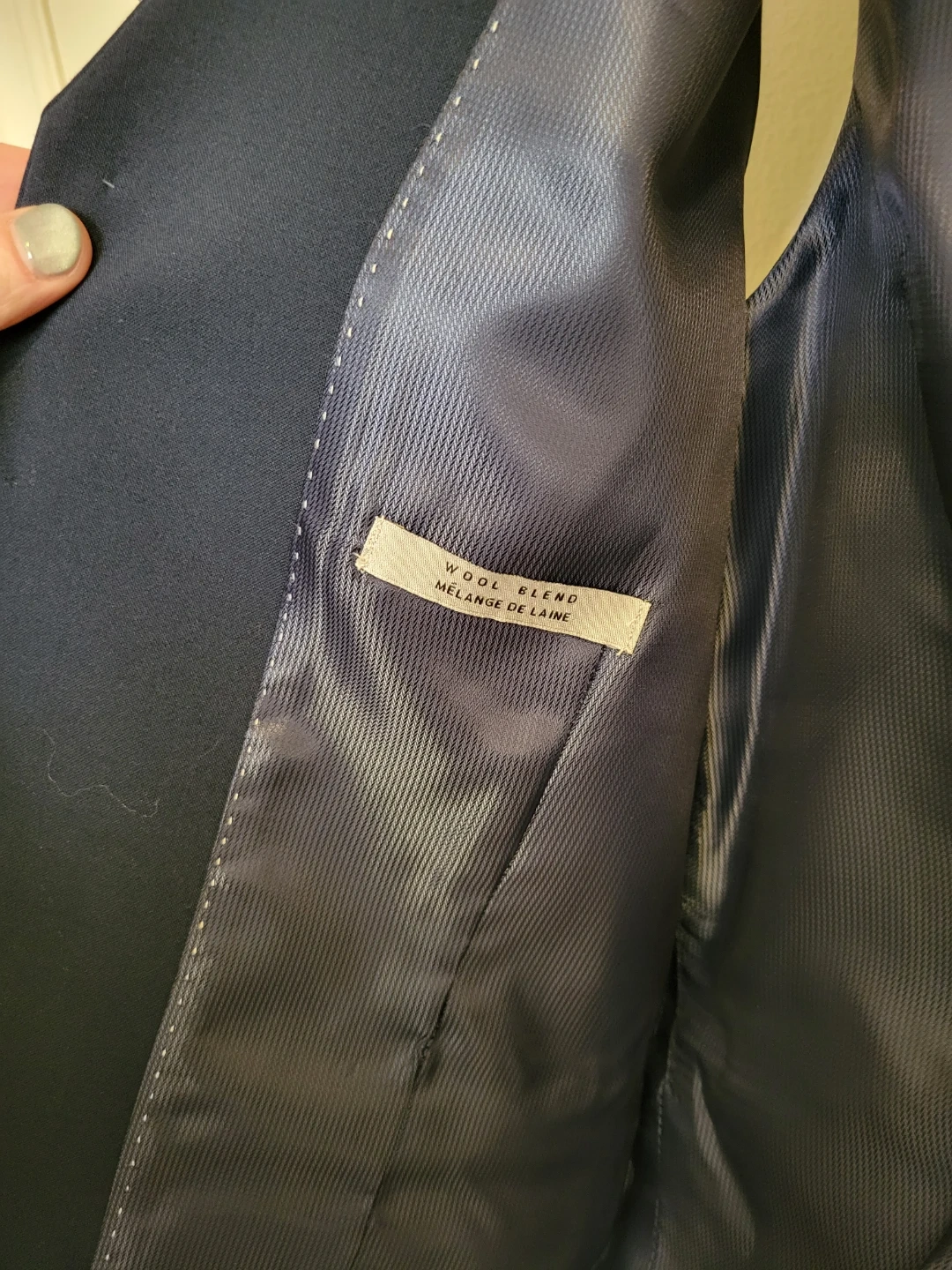 This is a LE CHÂTEAU navy vest. It's a contemporary fit with a wool blend. The lining is made of polyester and spandex.