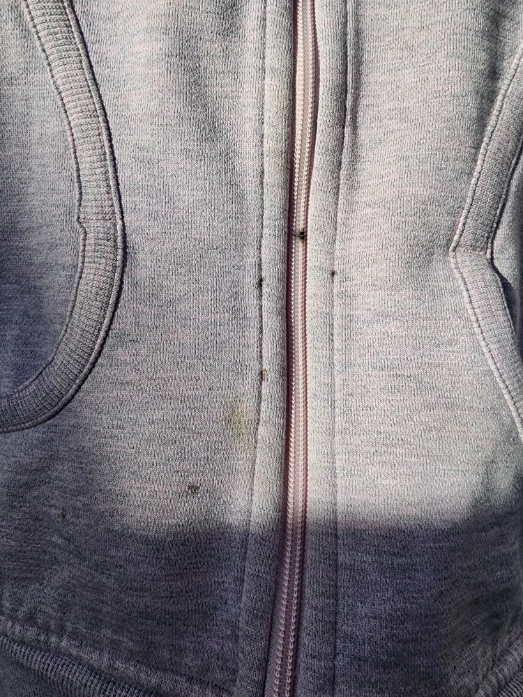 Women's zip-up hoodie. Light purple colour. Features a hood and front pockets. Used condition but still warm and nice. zipper dangle missing, a couple of very small stains.