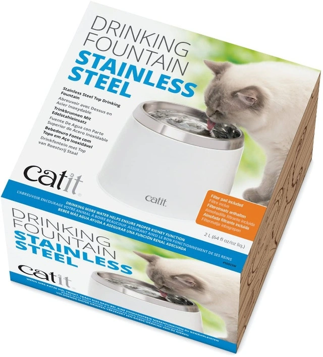 Catit Stainless Steel Top Drinking Fountain - 2 L (64 fl oz), White - 64 fluid ounce Stainless Steel drinking fountain - High-quality stainless steel top - Provides a continuous supply of fresh and filtered water - Re-circulating system-Cools and aerates water, inhibits bacteria growth - One Premium replaceable carbon filter included