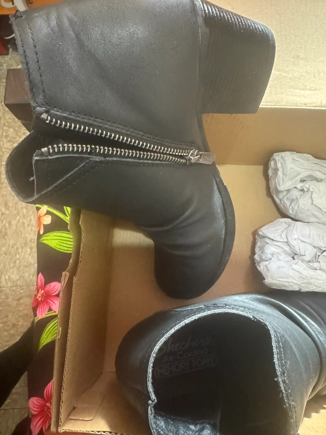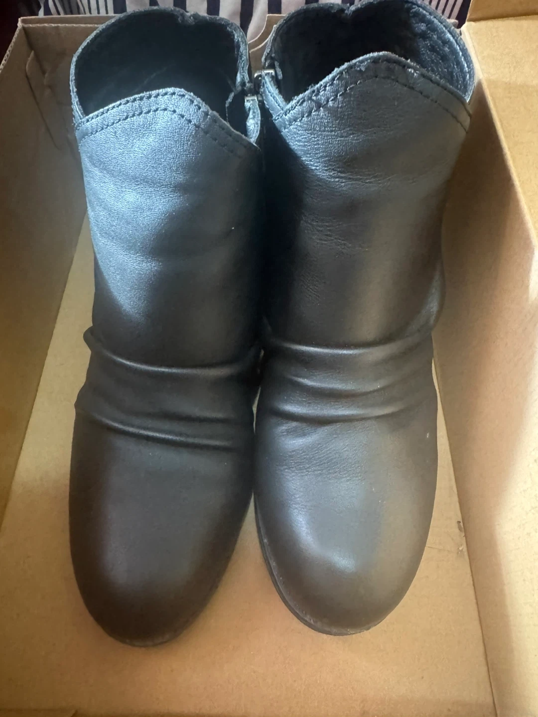 Skechers women's ankle boots in black. These faux leather boots feature a side zipper and a Western-inspired design. Size 10 women's.