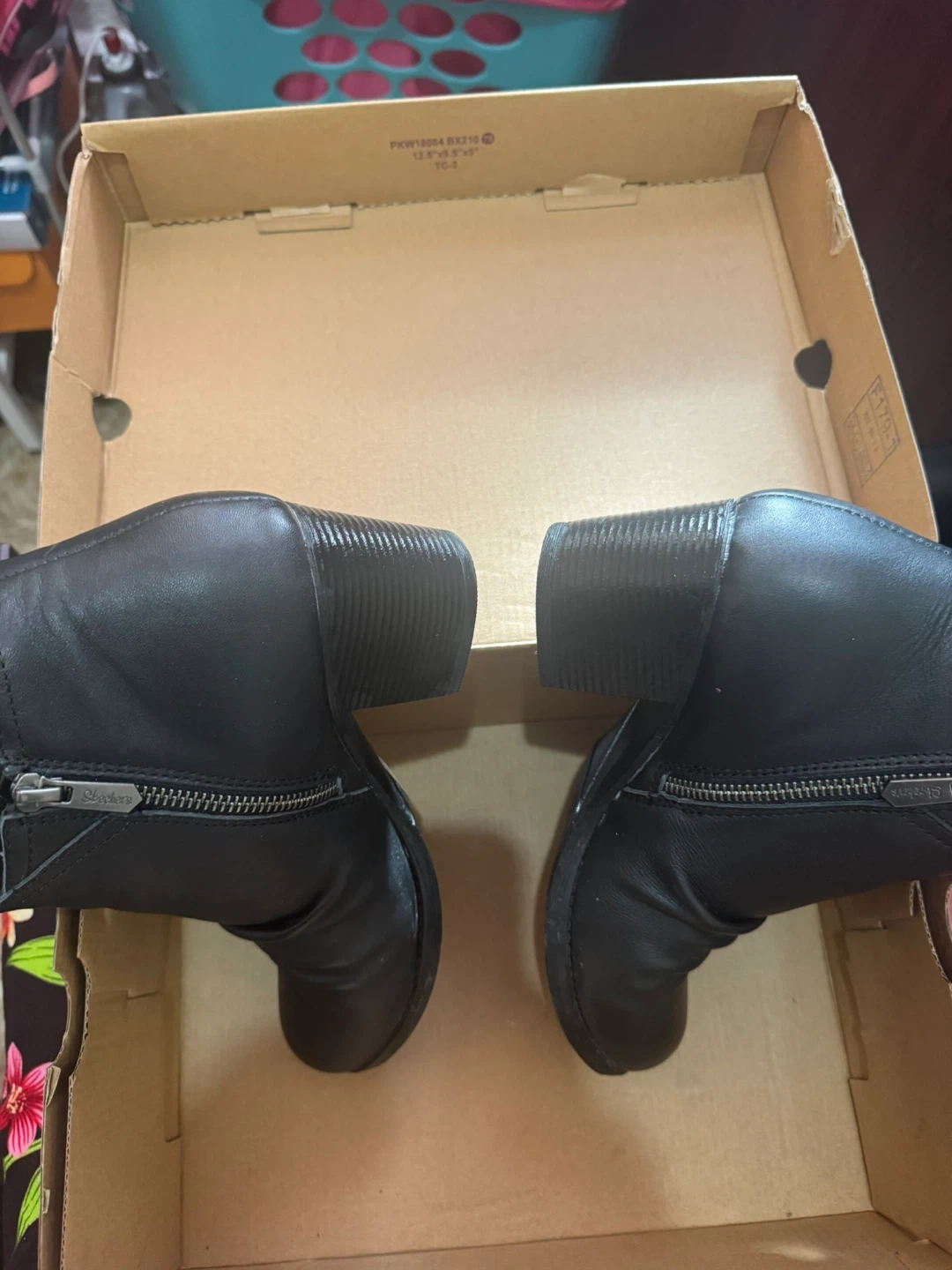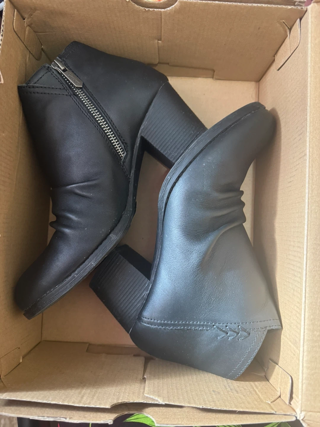 Skechers women's ankle boots in black. These faux leather boots feature a side zipper and a Western-inspired design. Size 10 women's.