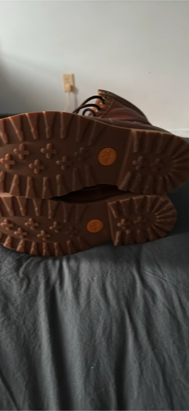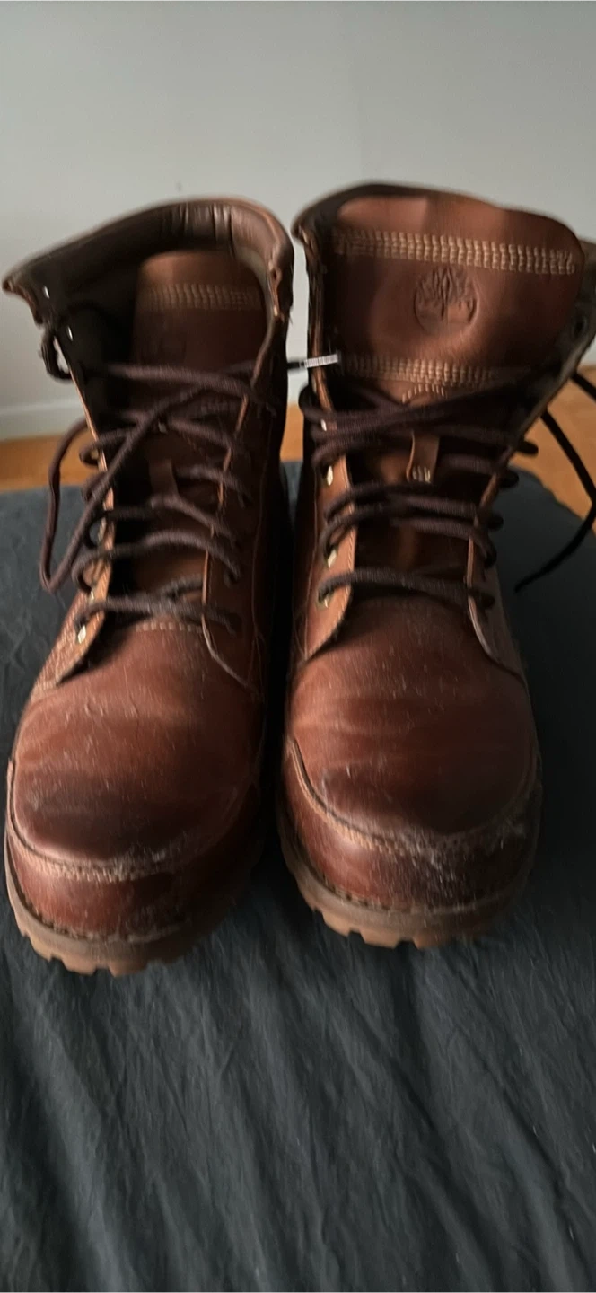 These Timberland boots are made of brown leather with a lace-up closure. They have a durable rubber sole. These would be great for outdoor wear or casual use.