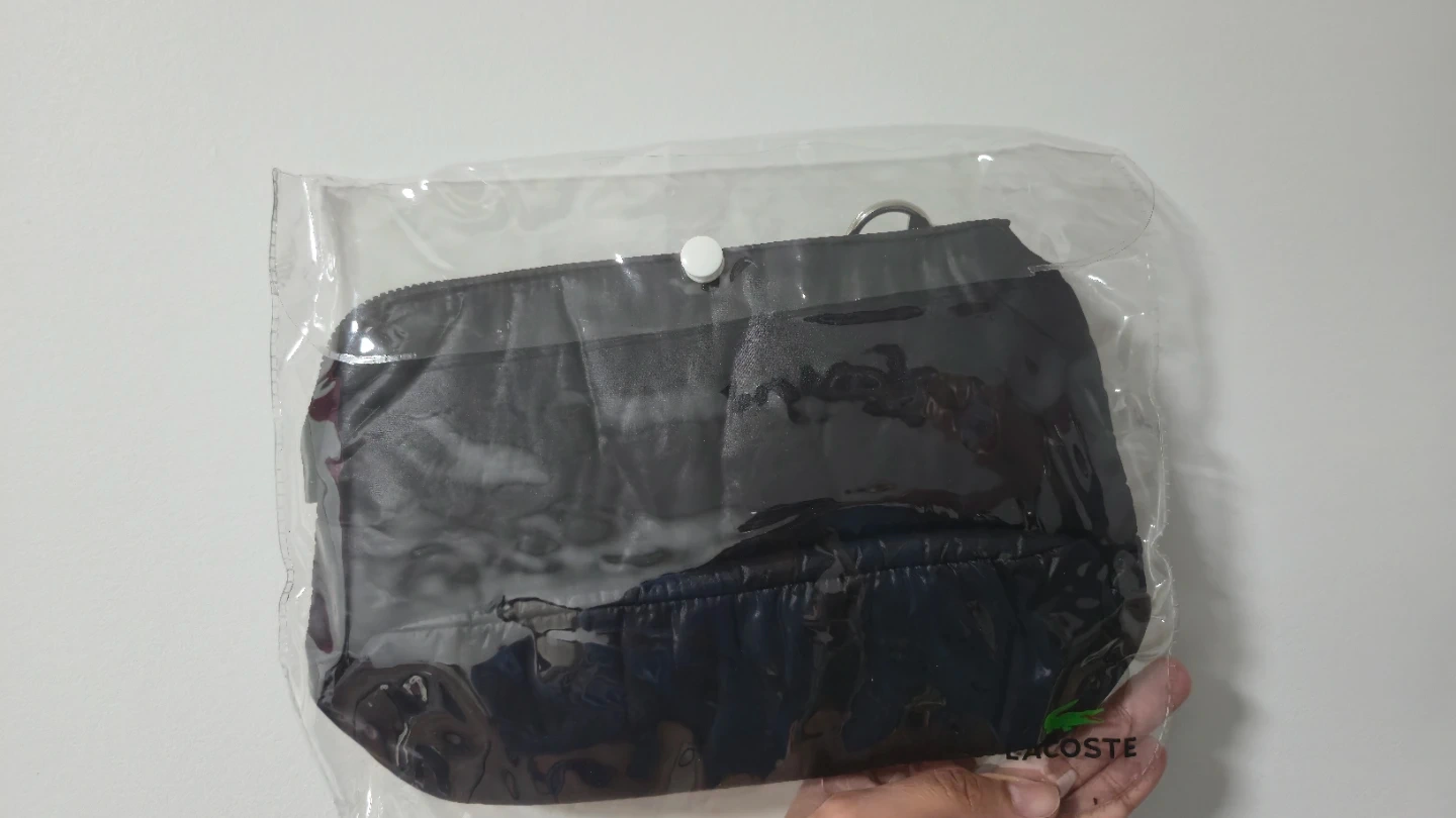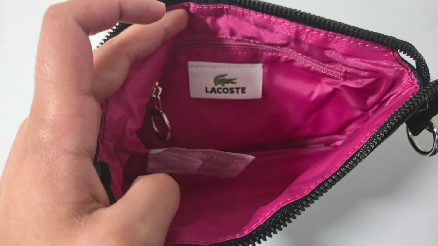 This is a Lacoste black pouch bag. It features a zipper closure and a pink interior lining with the Lacoste logo. The exterior has an embossed Lacoste logo design. It's in new condition and comes in its original packaging!