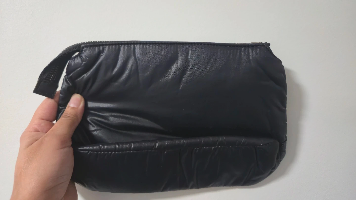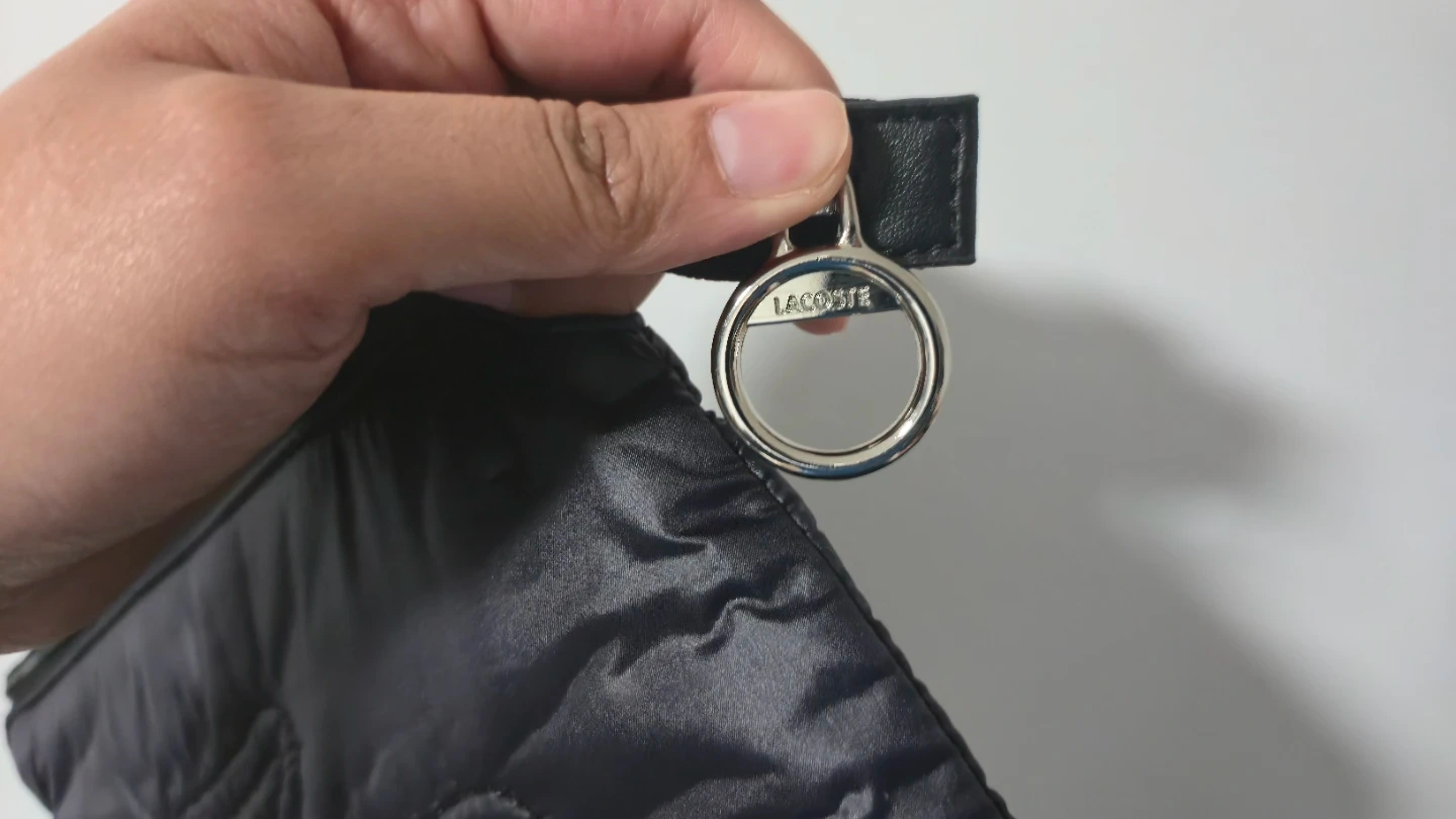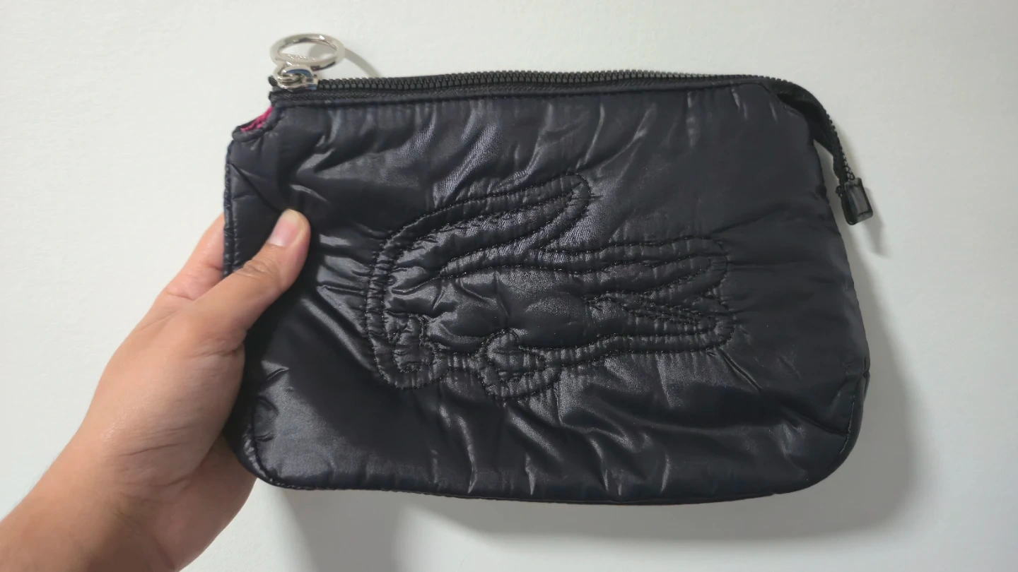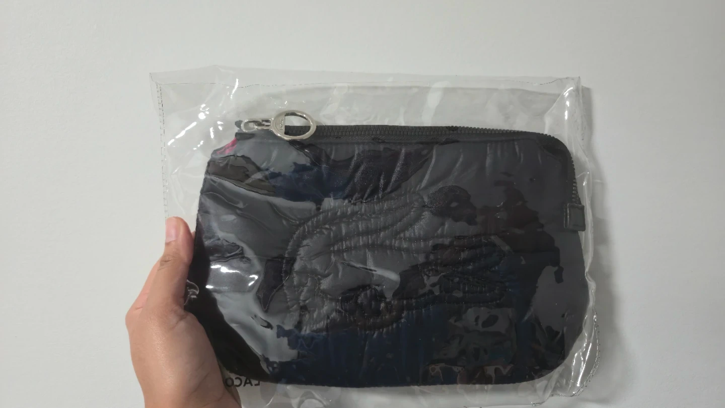 This is a Lacoste black pouch bag. It features a zipper closure and a pink interior lining with the Lacoste logo. The exterior has an embossed Lacoste logo design. It's in new condition and comes in its original packaging!