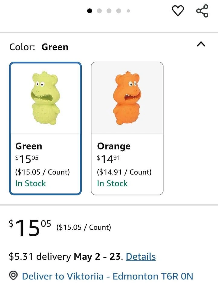 Buy & SellDog Squeaky ToyDog Squeaky Toy$10Dog Squeaky Toy Clean Teeth Dog Toys Rubber Bite Interesting for Dog Pet Supplies (Green)WHERE TO MEETCheck LocationView MapSELLERverifiedVikiS Terwillegar1276 reviews0 chats·0 favorites·4 viewsSEND CHAT TO SELLERHi Viki! I’m interested in your listing.Hi Viki! I’m interested in your listing.Get the Karrot app to chatSign In to chat