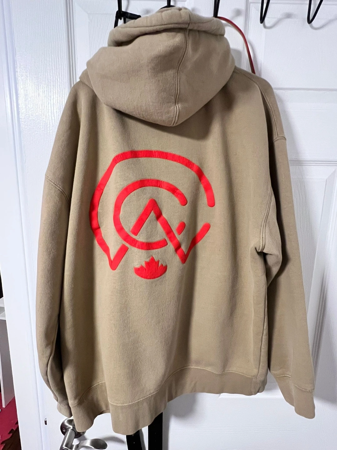 Tan coloured hoodie with red branding. Front features the words "Canadian Custom Apparel" and the back features a logo.