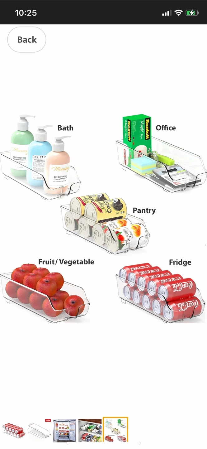 This clear plastic organizer is great for storing cans in the fridge or pantry. It's made of durable plastic and holds up to 10 cans. Keep your drinks tidy and easily accessible!