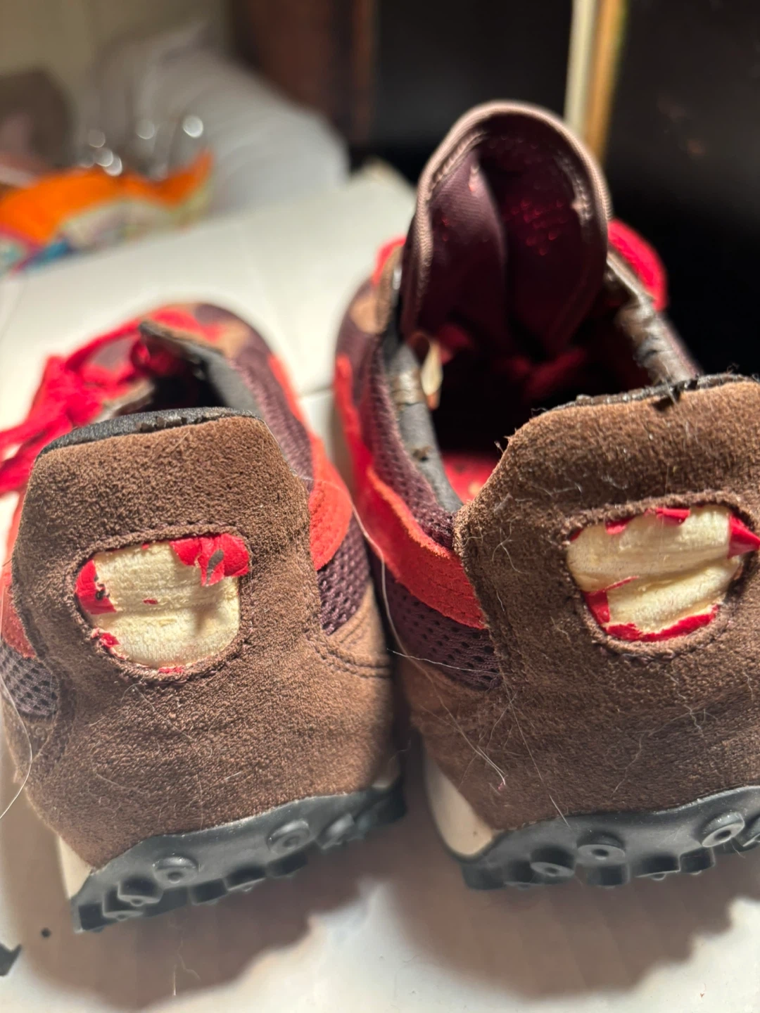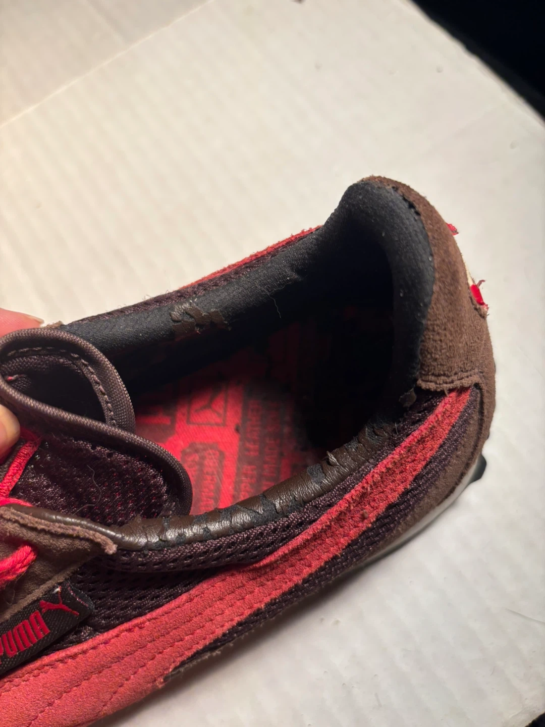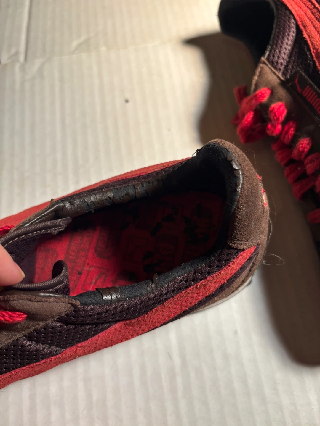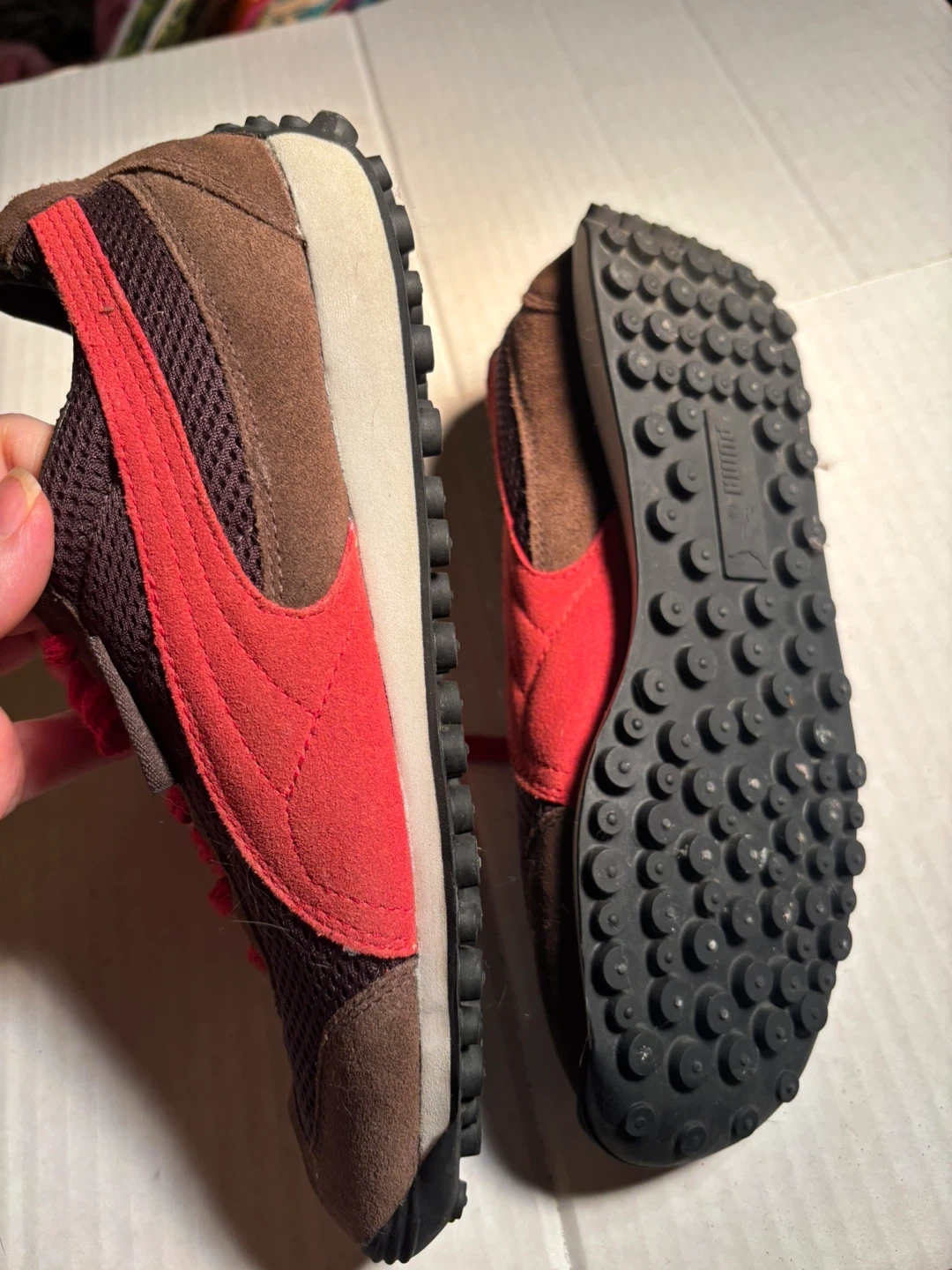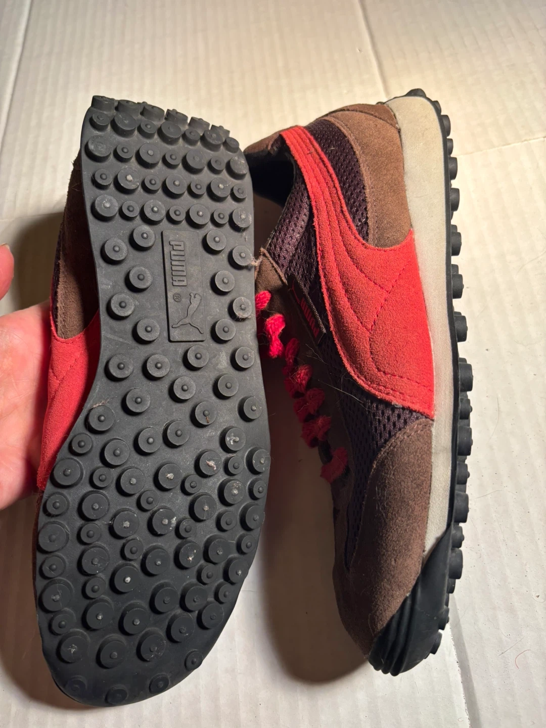 These Puma soccer shoes are gorgeous and sturdy – they are brand new but the vinyl at the entry is peeling from the age. Made with a mix of suede and mesh. They feature a durable rubber sole with a unique tread pattern. Red laces and detailing add a pop of color.