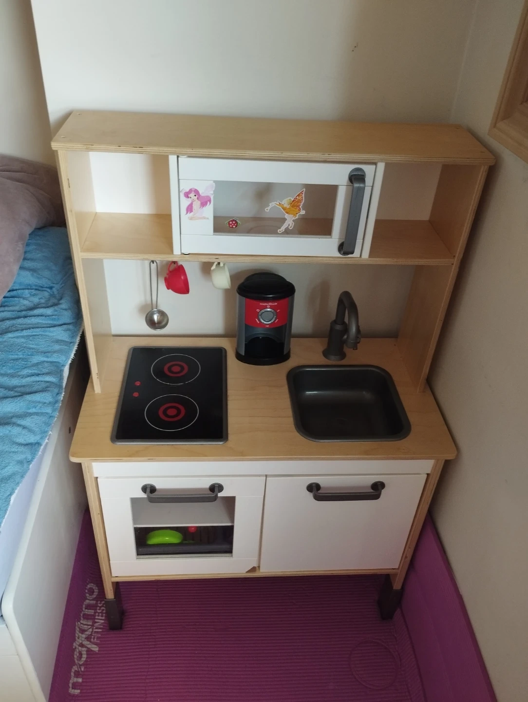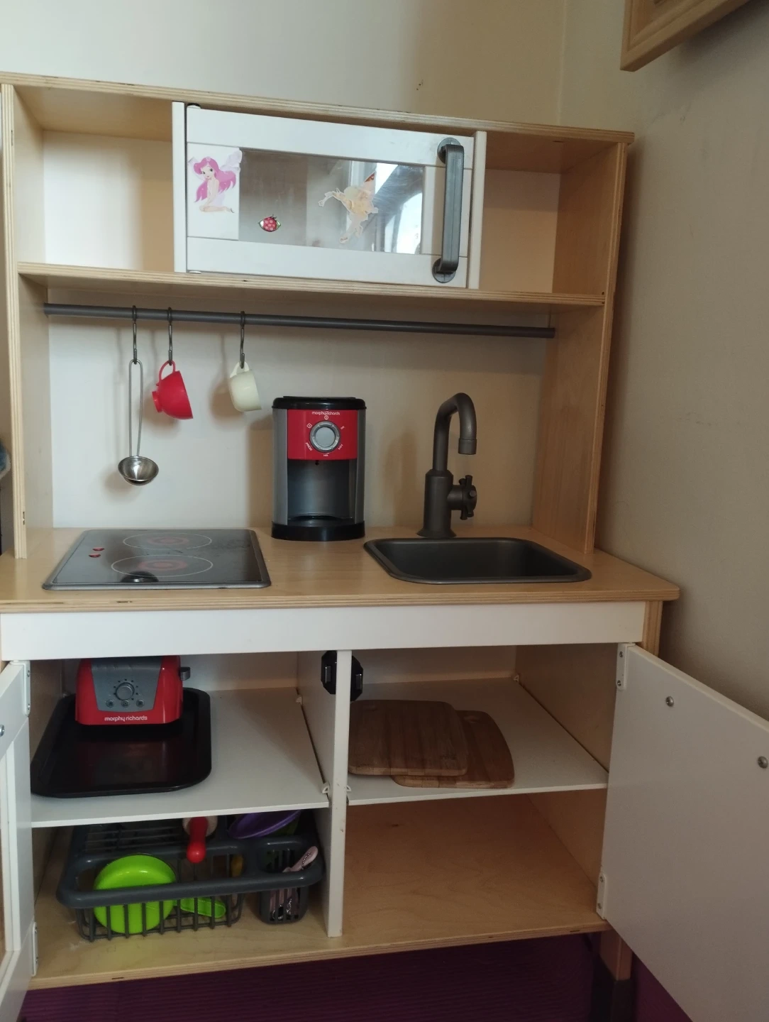 This play kitchen has a microwave, stove, sink, and coffee maker. It includes pots, pans, and utensils for little chefs. Made of wood and plastic, it's great for imaginative play. Perfect for hours of kitchen fun!