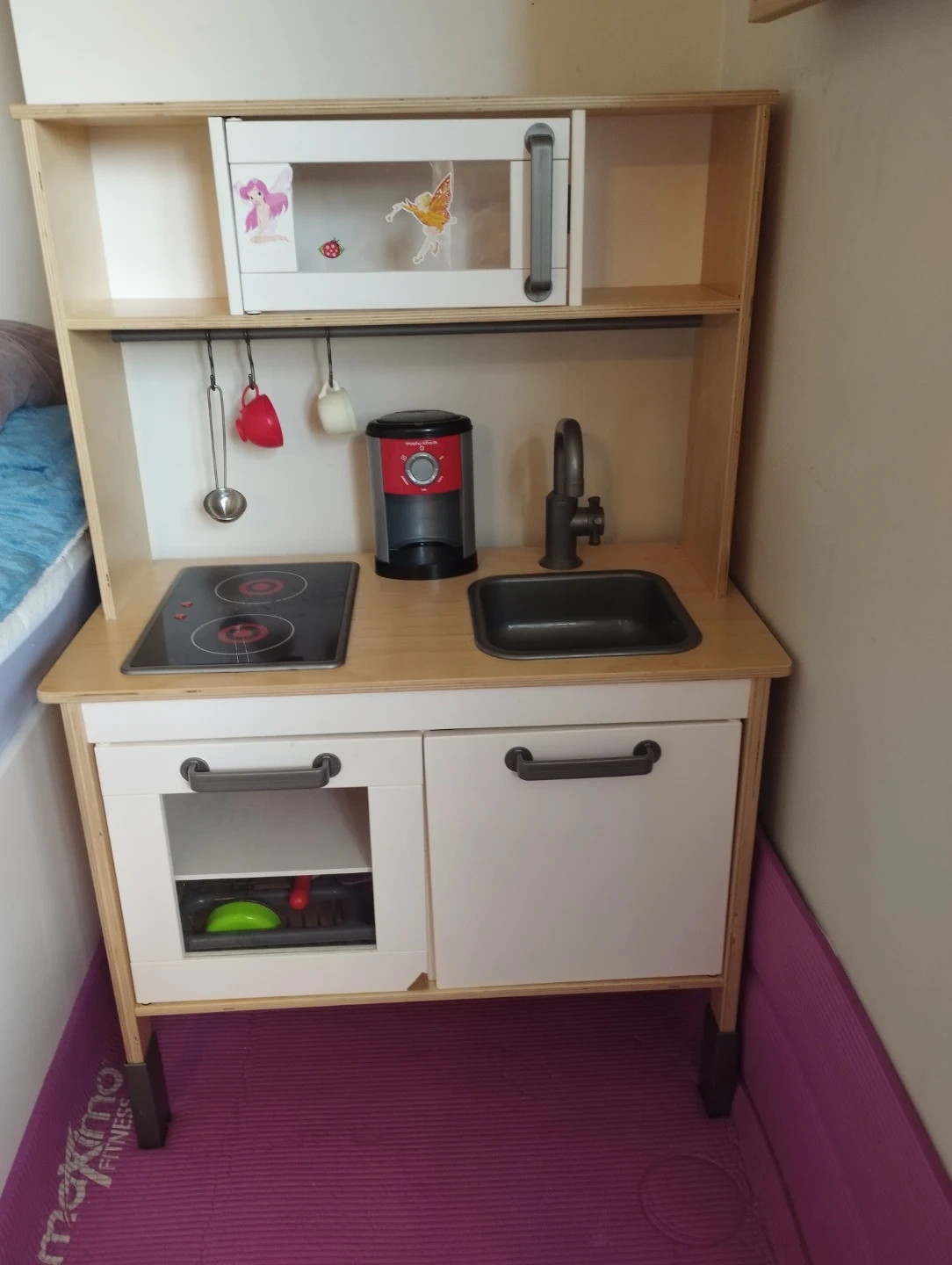 This play kitchen has a microwave, stove, sink, and coffee maker. It includes pots, pans, and utensils for little chefs. Made of wood and plastic, it's great for imaginative play. Perfect for hours of kitchen fun!