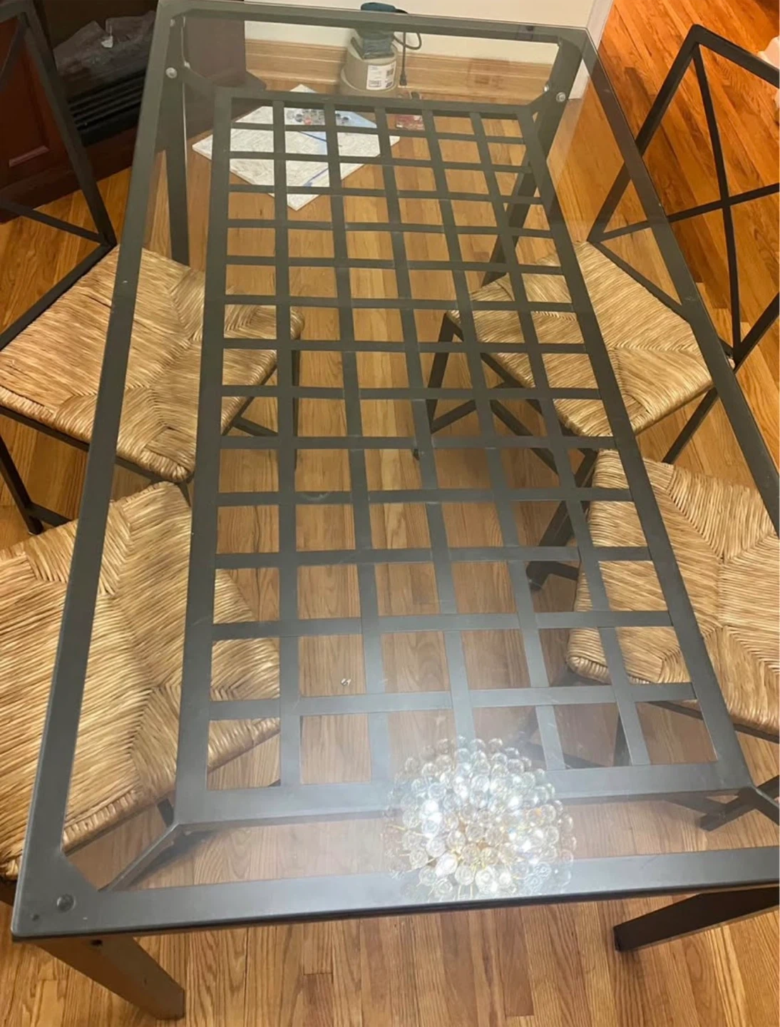 Glass Dining Table with 4 Straw Woven Chairs
