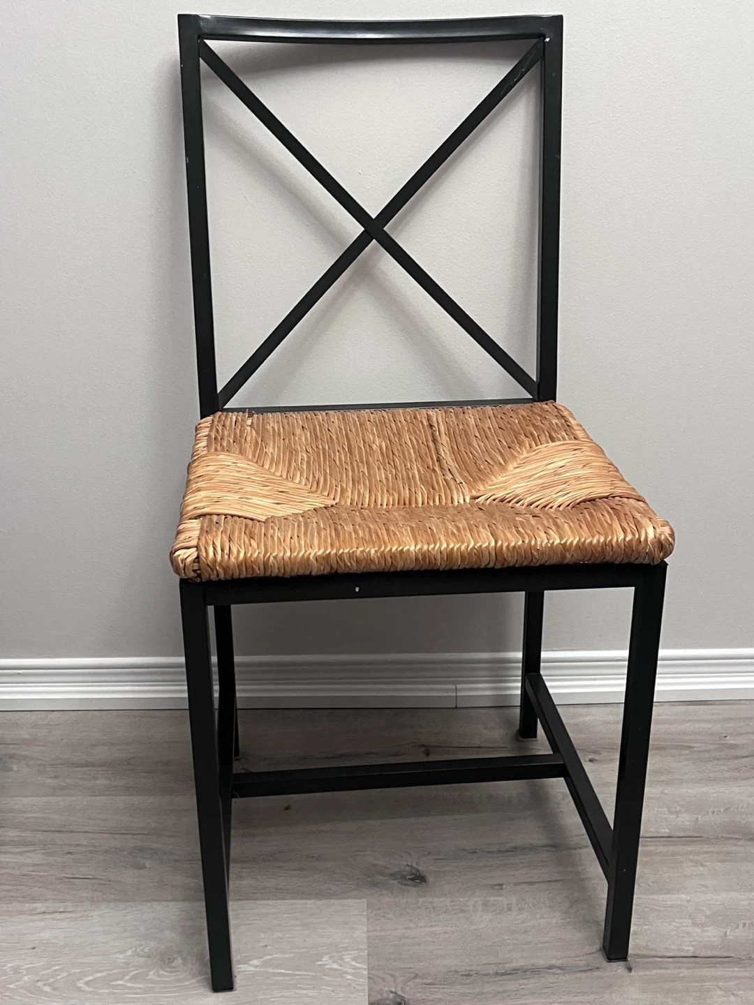 This set includes a rectangular glass dining table with a black metal frame and a grid design. Four chairs with black metal frames and woven straw seats are included. It's a stylish and functional dining set for your home.