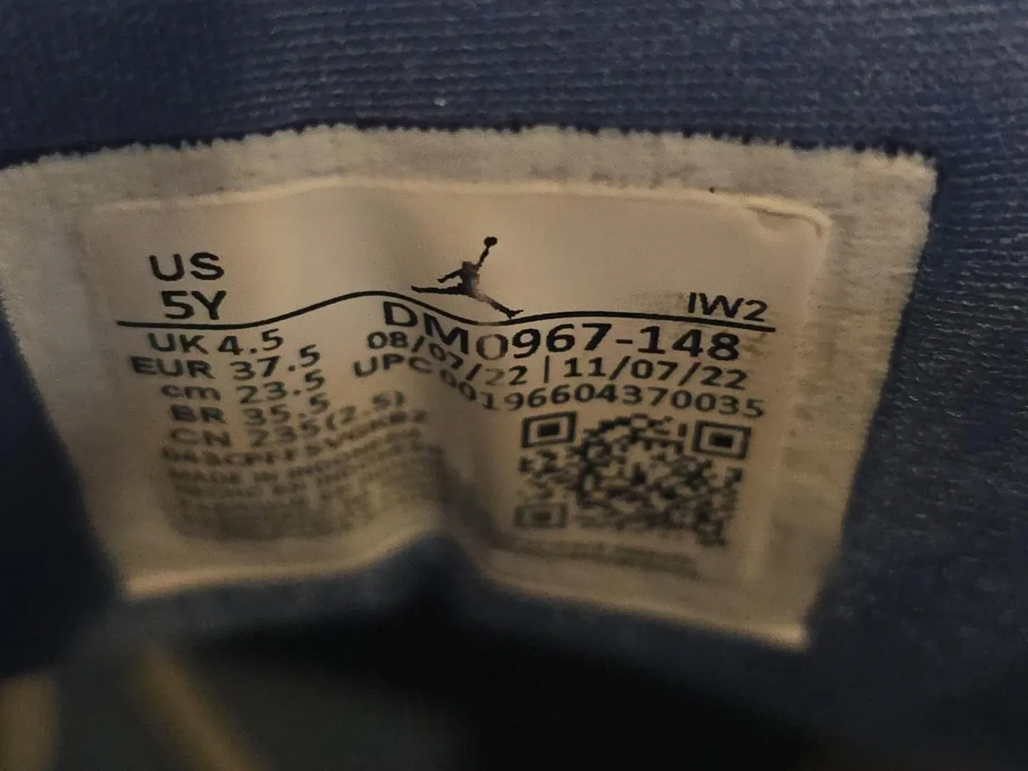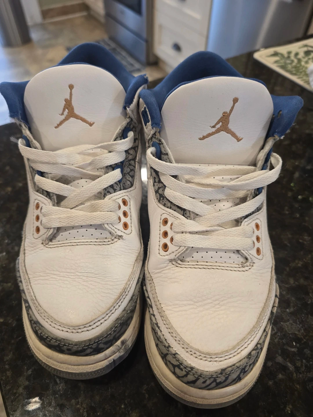 Selling a pair of Air Jordan 3 Retro in white and blue. They are in used condition, as shown in the photos. The size is US 5Y, UK 4.5, EUR 37.5, CM 23.5.