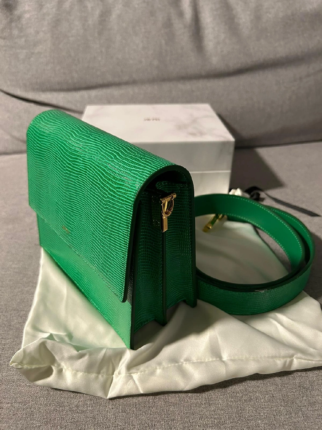 Selling a JW PEI bag in a vibrant green lizard texture! It comes with its original box and dust bag. This stylish bag is perfect for adding a pop of colour to any outfit. The unique lizard texture makes it a real standout piece!