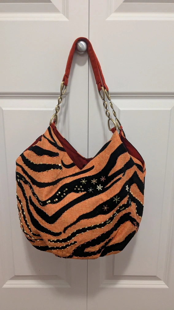 Brand new large orange and black zebra print handbag with a chain strap. It includes a matching zippered cosmetics bag.