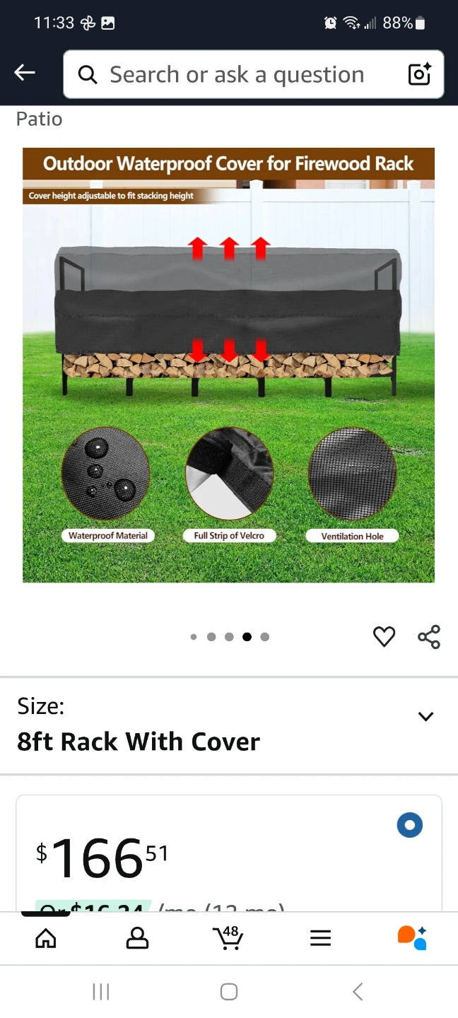 8ft outdoor firewood rack. Black metal frame. Includes waterproof cover. Adjustable cover height. Strong and heavy-duty. Suitable for indoor or outdoor use.