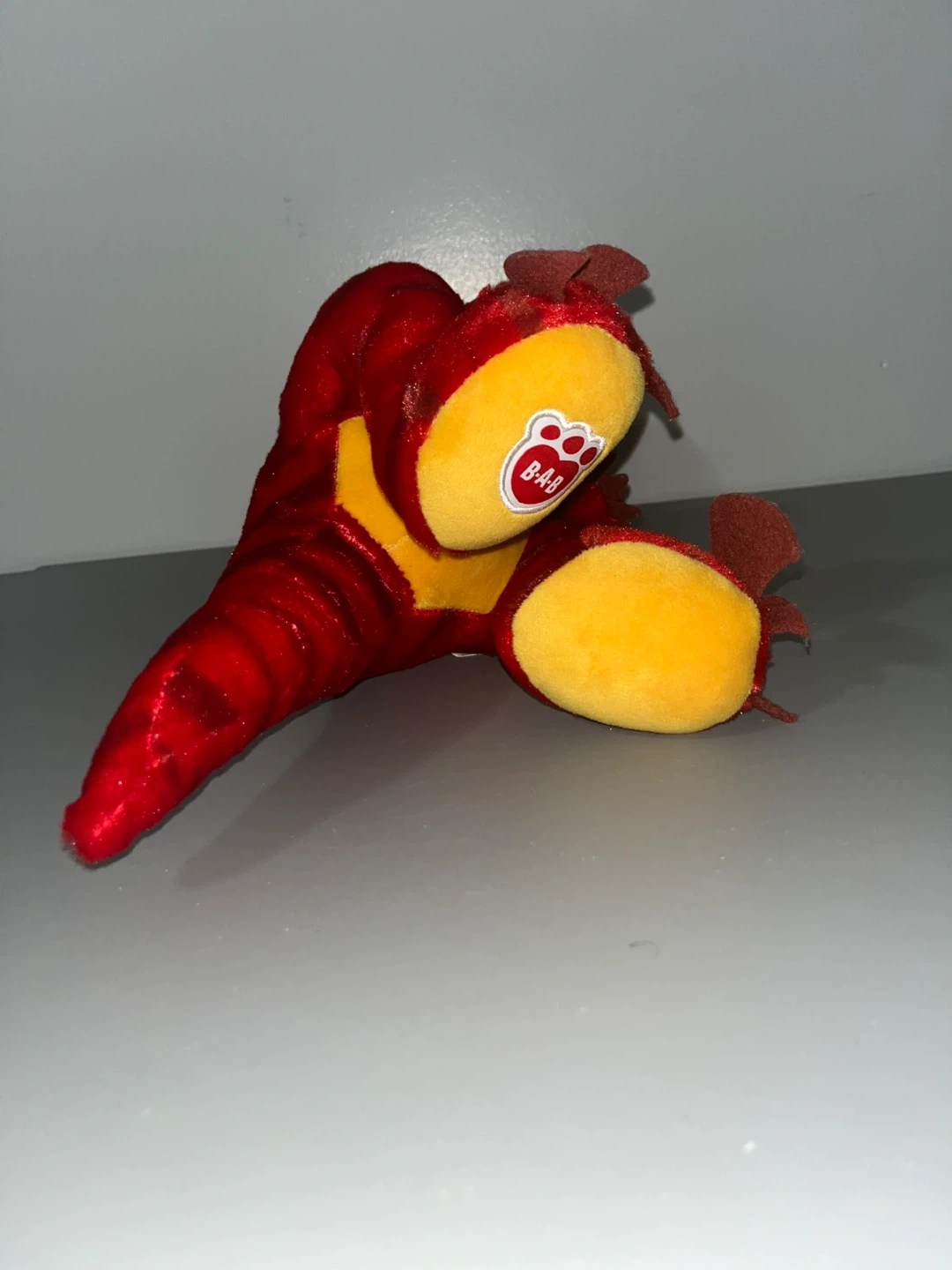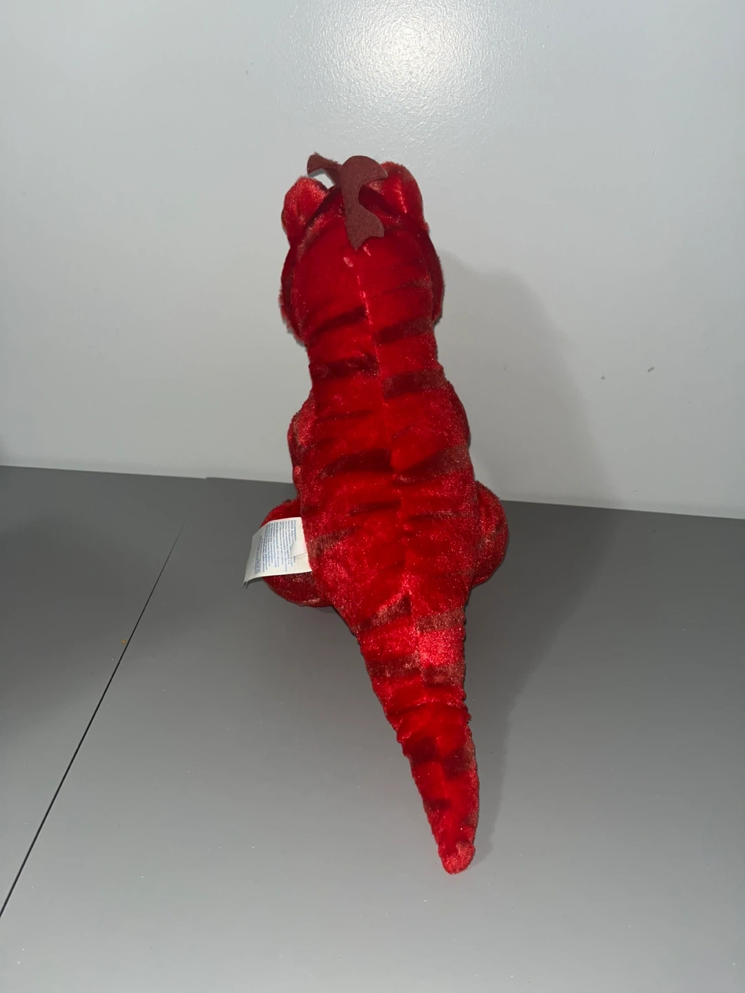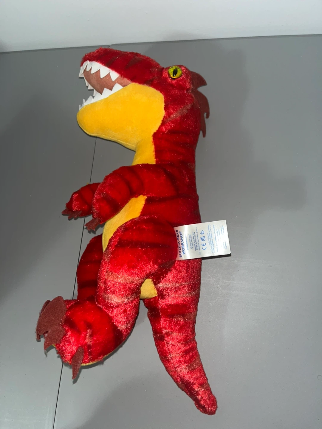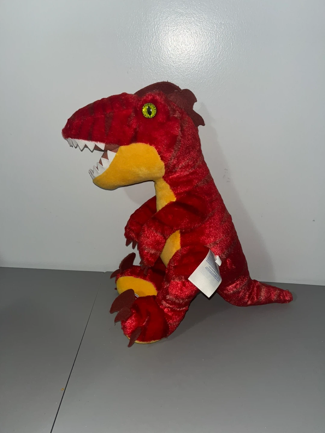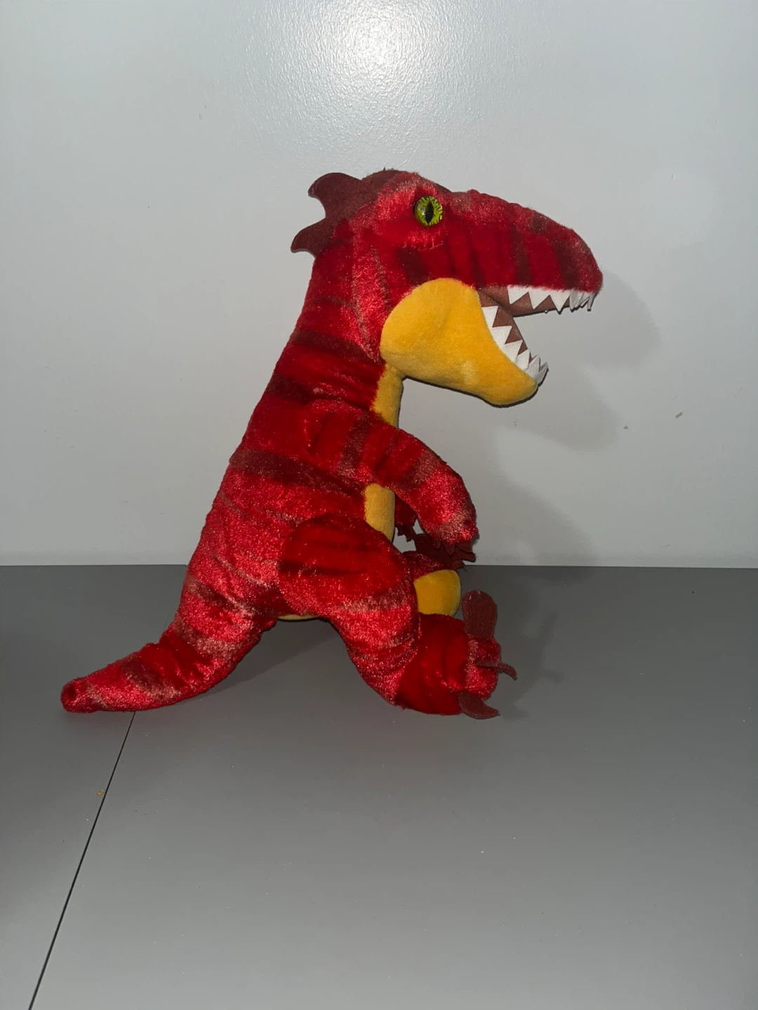 Here's a fun red dinosaur plush! It's in great shape and ready for a new home. The plush is red with yellow accents and has a friendly, toothy grin. Perfect for any dinosaur lover!
