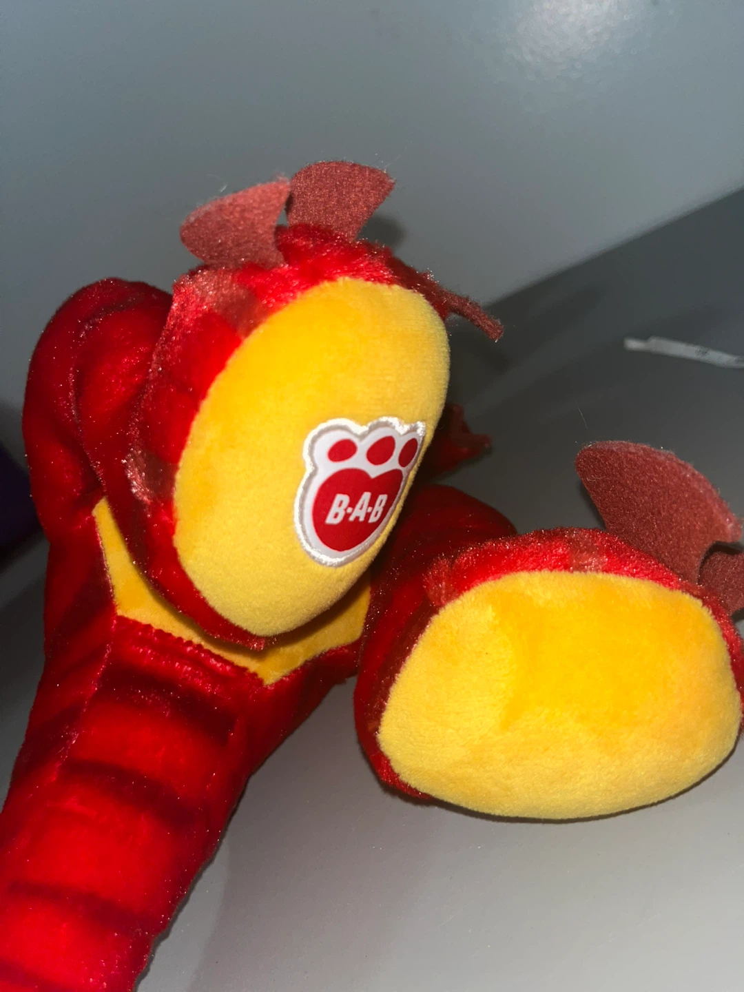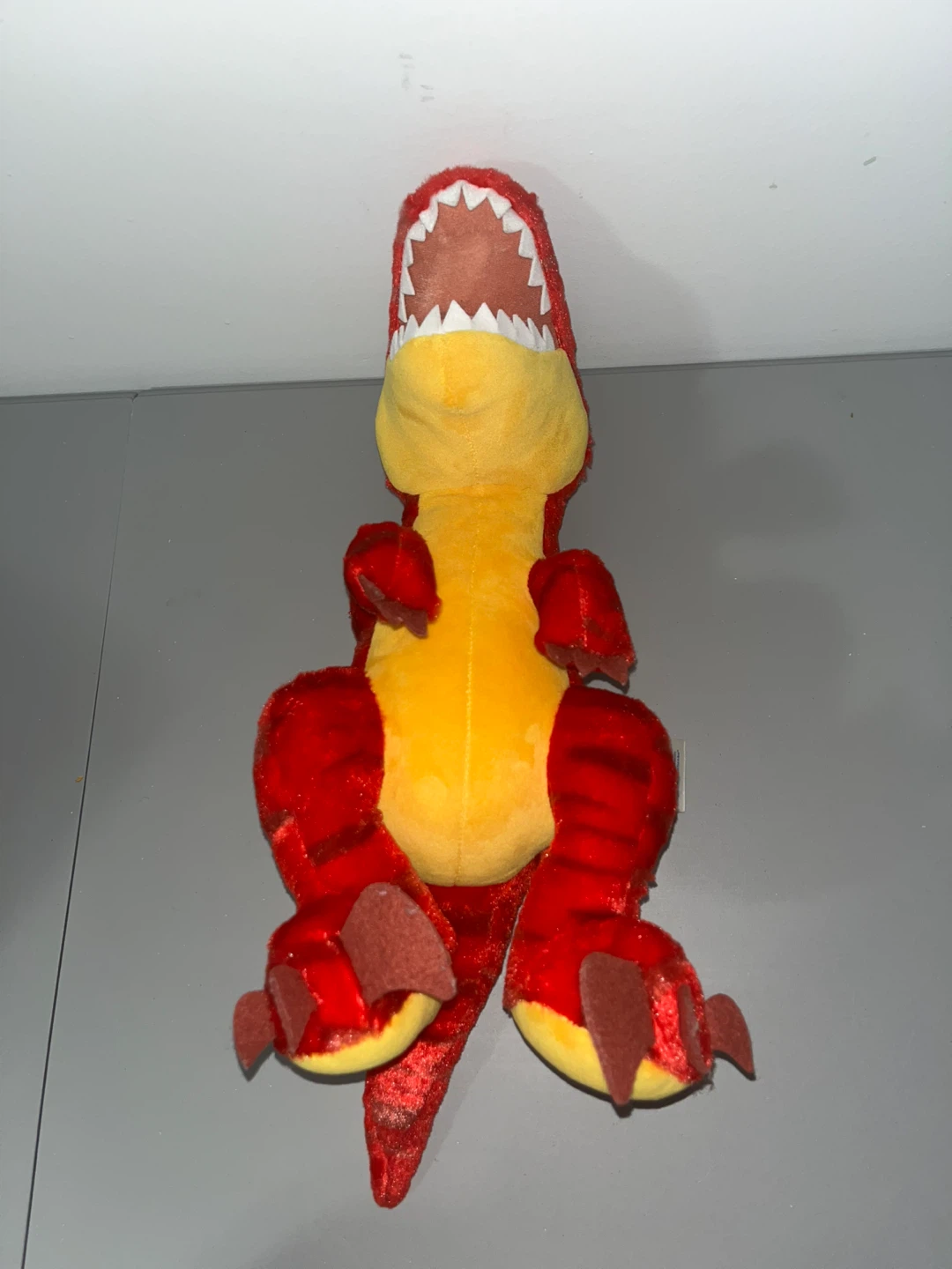 Here's a fun red dinosaur plush! It's in great shape and ready for a new home. The plush is red with yellow accents and has a friendly, toothy grin. Perfect for any dinosaur lover!