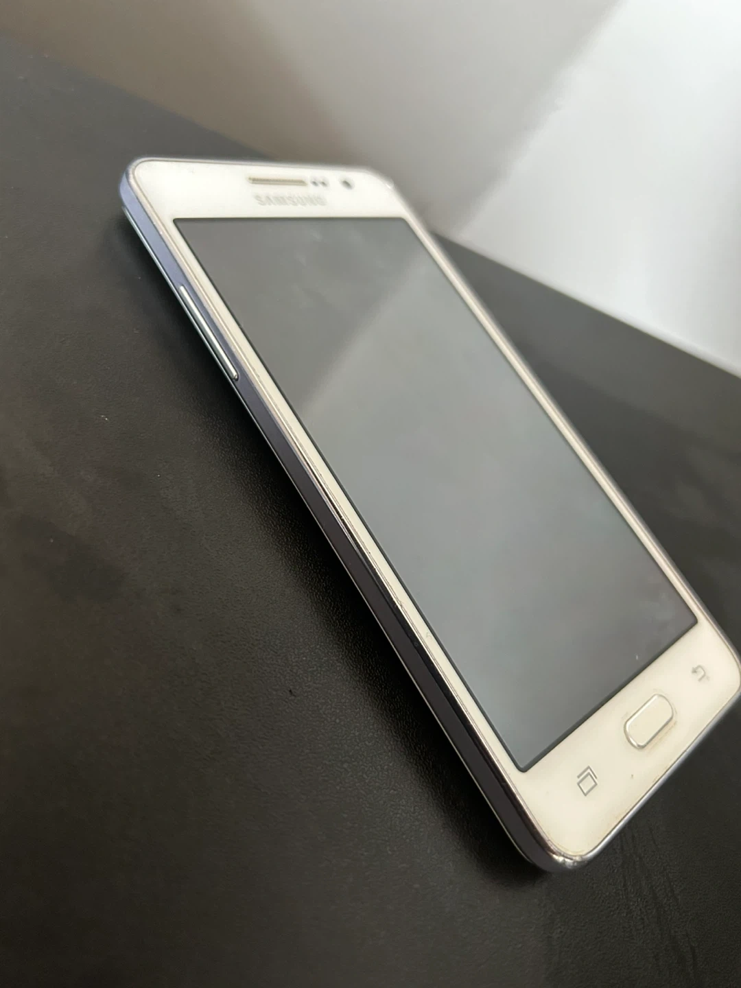 Samsung Galaxy Grand Prime smartphone in white. It's a Cricket Wireless phone. Shows signs of normal wear and tear.