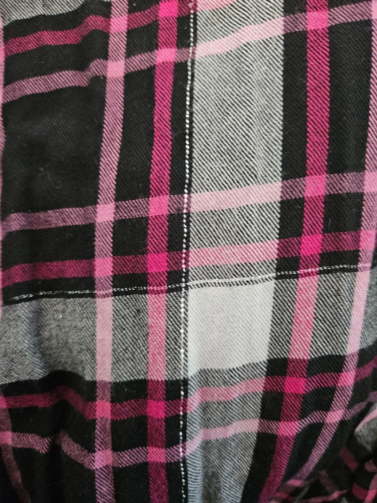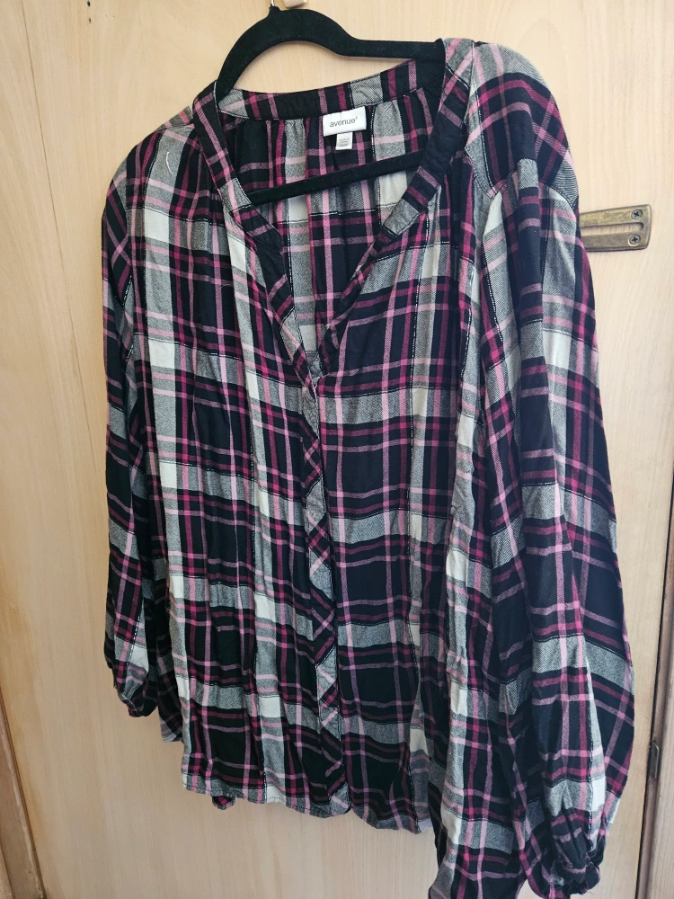 Avenue long-sleeve Flannel, purple and white with threads of silver. Elastic sleeves, pullover style. Breezy and comfortable.