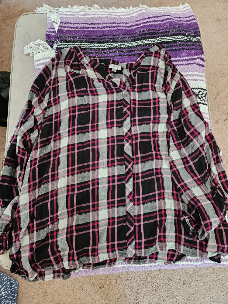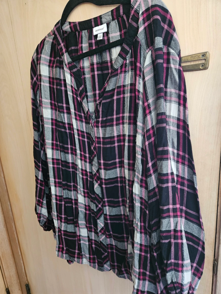 Avenue long-sleeve Flannel, purple and white with threads of silver. Elastic sleeves, pullover style. Breezy and comfortable.