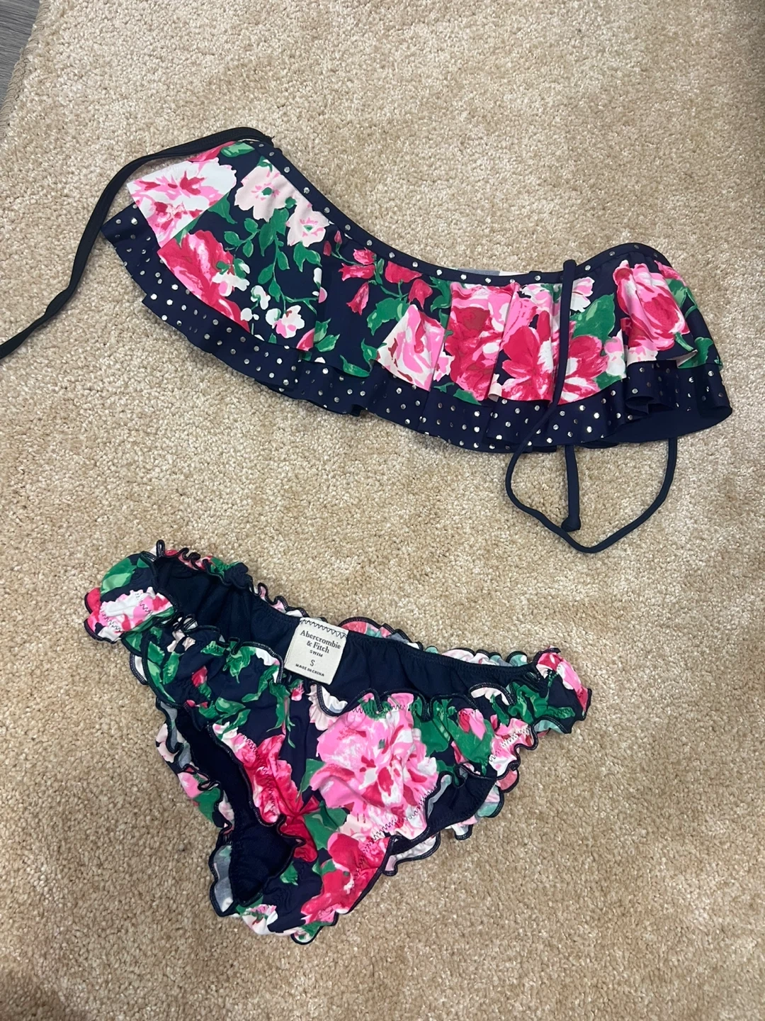Cute floral print bikini set from Abercrombie & Fitch. Includes a ruffled bandeau top and matching bikini bottoms. Size is S.