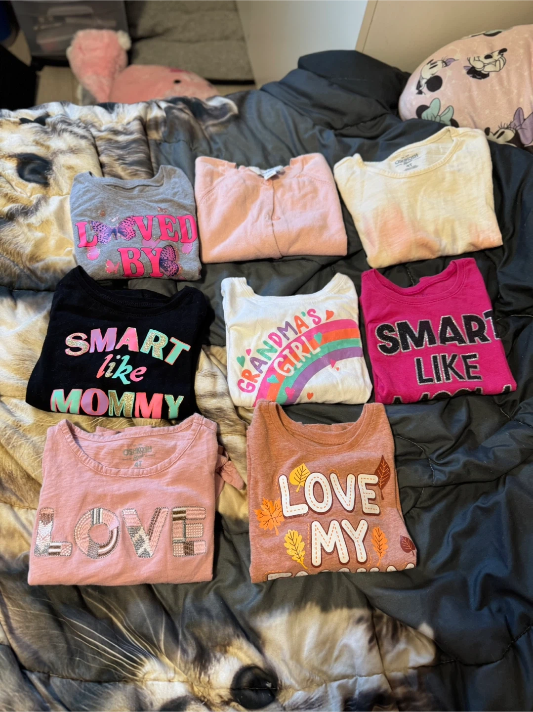 I have a collection of OshKosh toddler girl's t-shirts for sale. They are all size 4T and in great condition. The shirts include a variety of designs and colours.