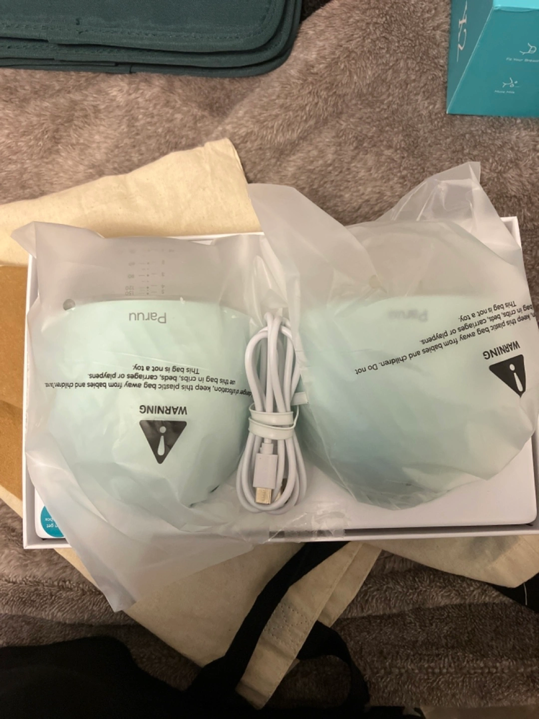Paruu X2 wearable breast pump. Double pump. Mint green colour. Includes charging cable.