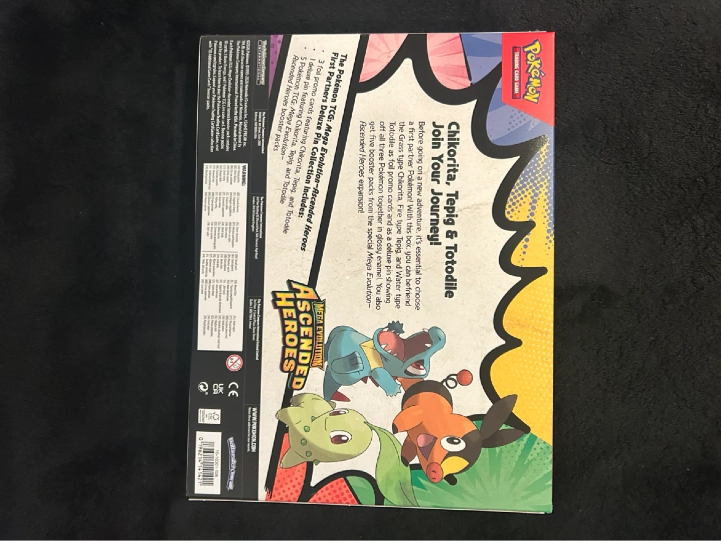 This Pokémon Trading Card Game set includes the Chikorita, Totodile, and Cyndaquil starters. It comes with three foil promo cards featuring these Pokémon, and three collector's pins. You'll also get three booster packs from the special Mega Evolution series. This collection is rated for ages 6+. Only one left