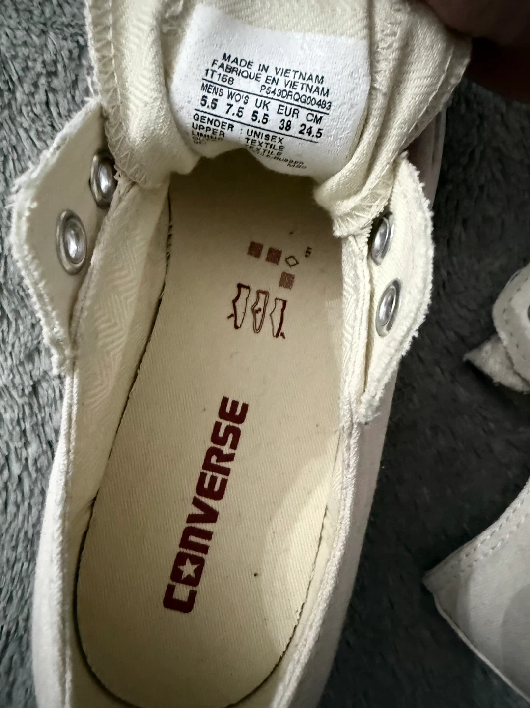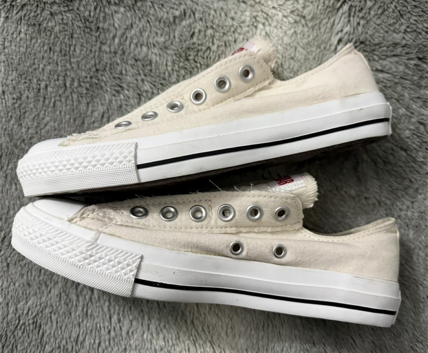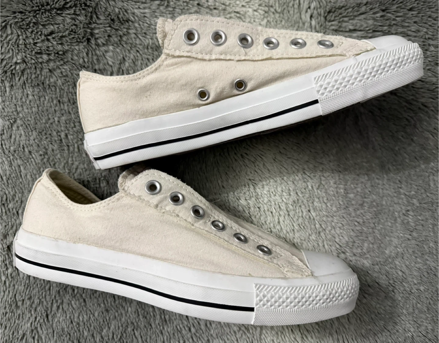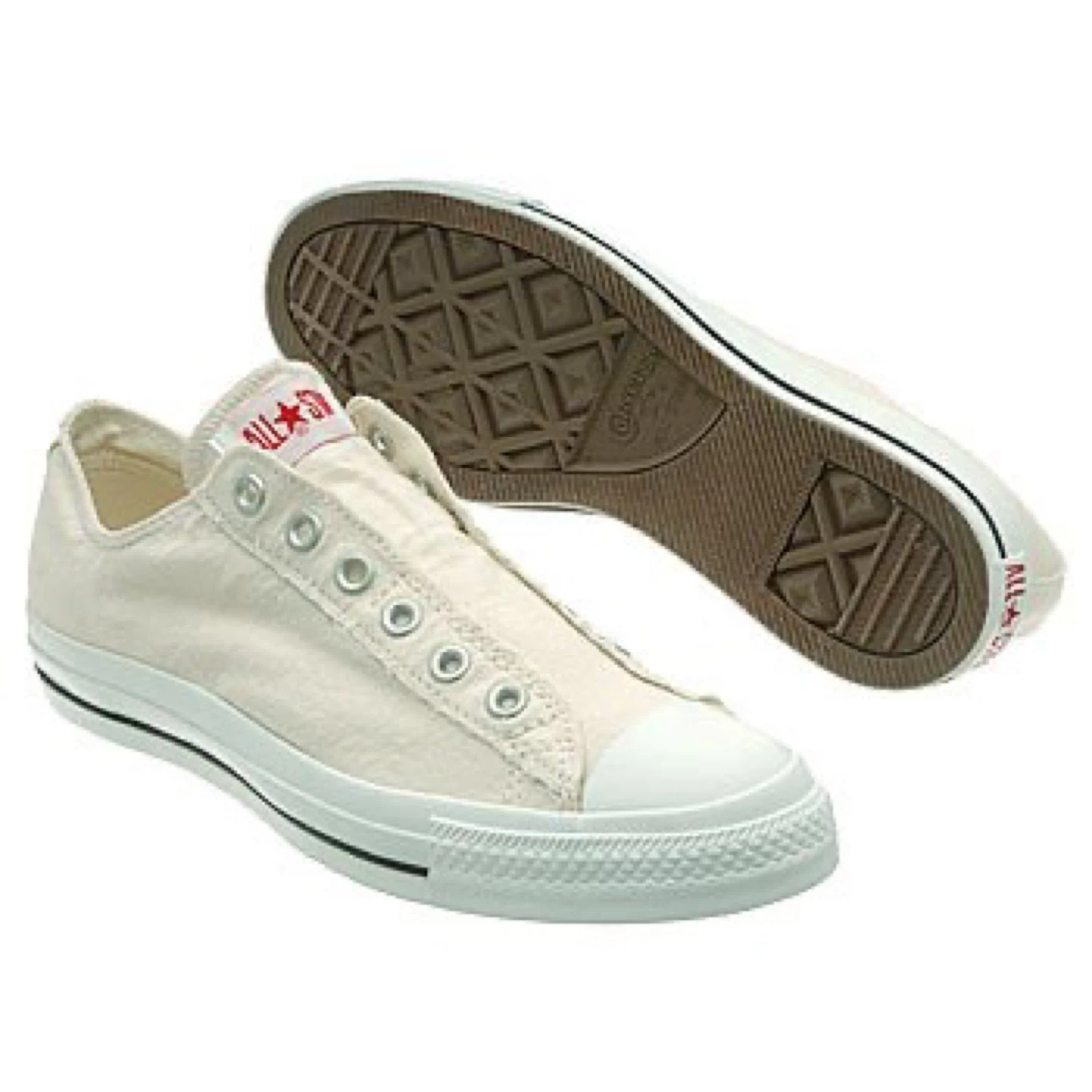 Cream canvas Converse All Star sneakers. These low-top shoes are made with a durable canvas upper and a rubber sole. They're slip-on style and come with metal eyelets. A classic casual shoe!
