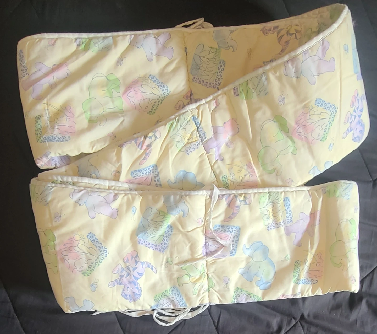 Yellow crib bumper featuring a charming pastel animal print. It's padded for comfort and has ties for secure attachment. This bumper adds a soft touch to any nursery!