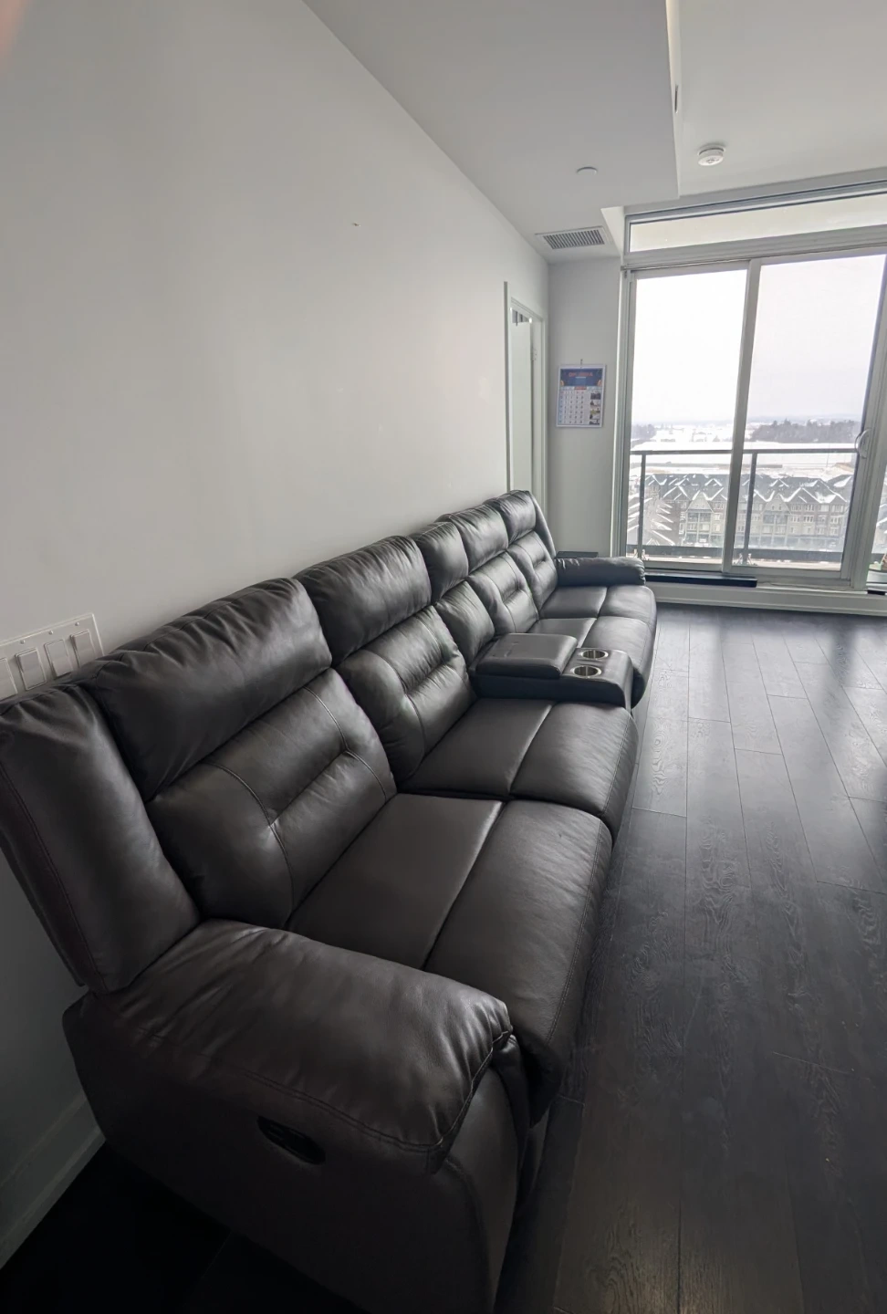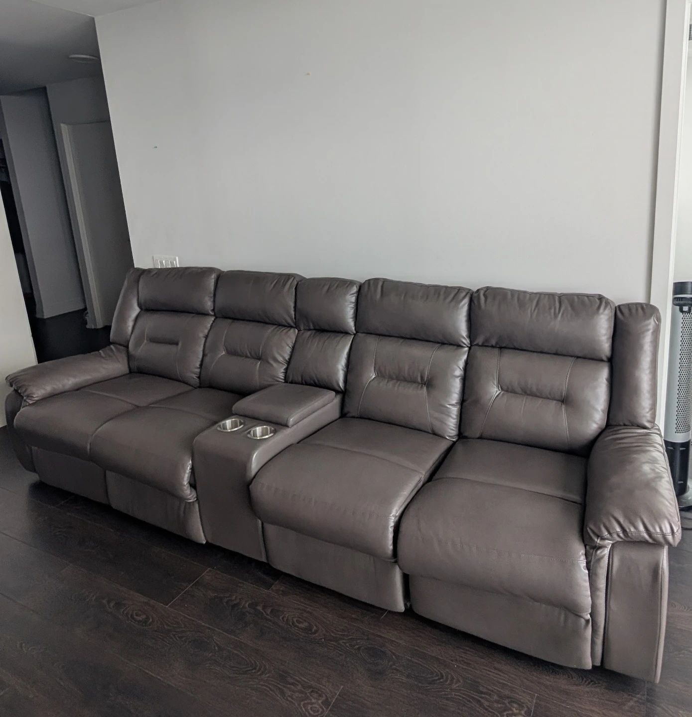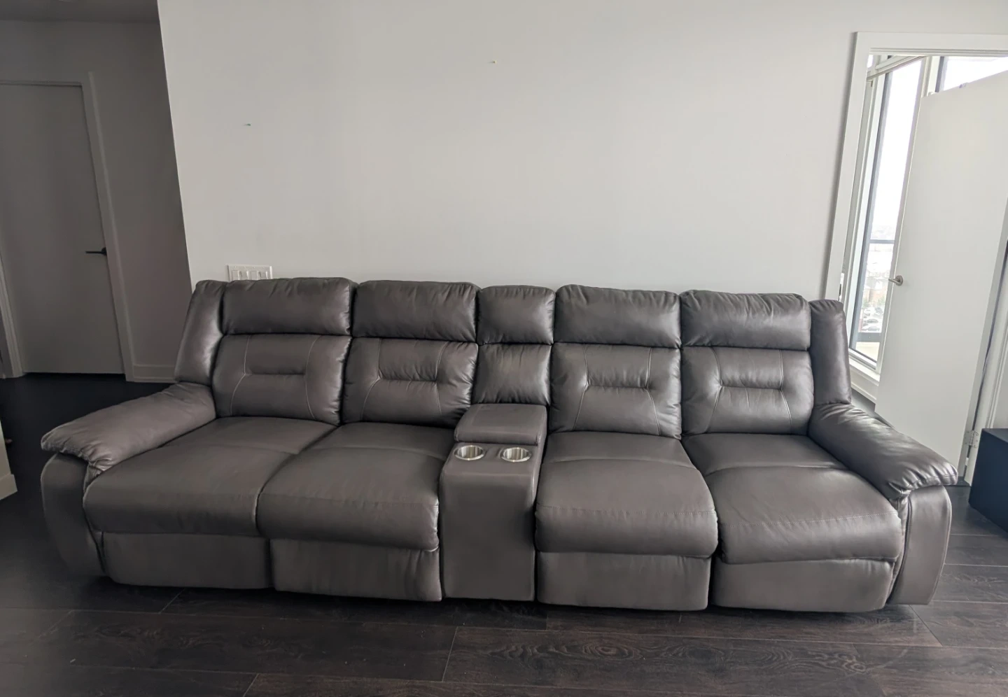Grey Leather Reclining Sofa with Cup Holders