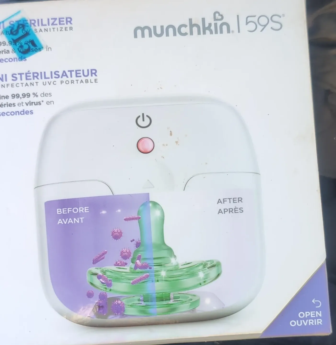 This Munchkin 1 59S sterilizer is a portable UVC sanitizer. It kills 99.99% of bacteria and viruses in seconds. It's great for on-the-go sanitizing needs!