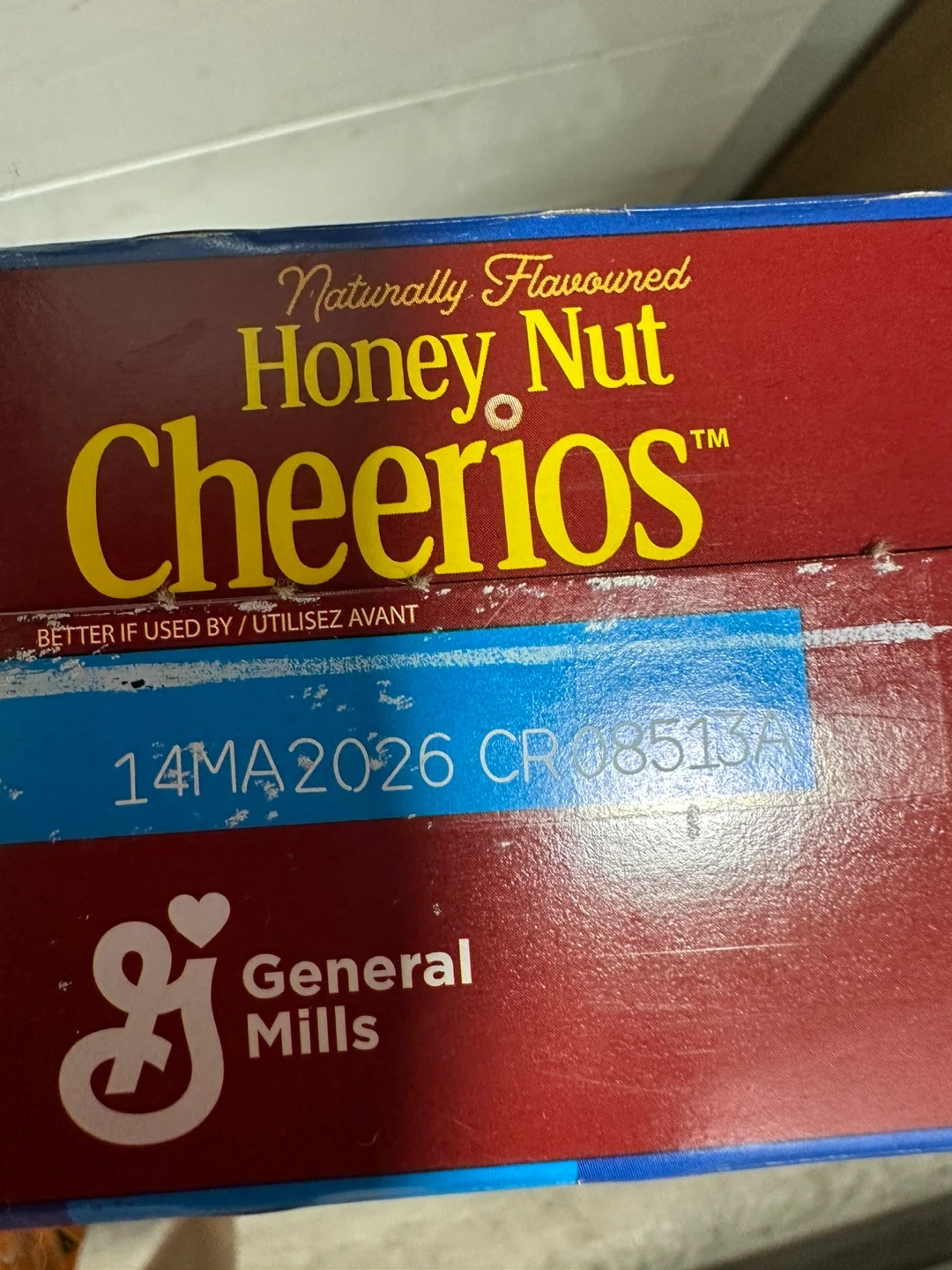 Selling a jumbo box of Honey Nut Cheerios! It's naturally flavoured and made with real honey. The box says it contains oat fibre that helps lower cholesterol. Better if used by 2026 May 14