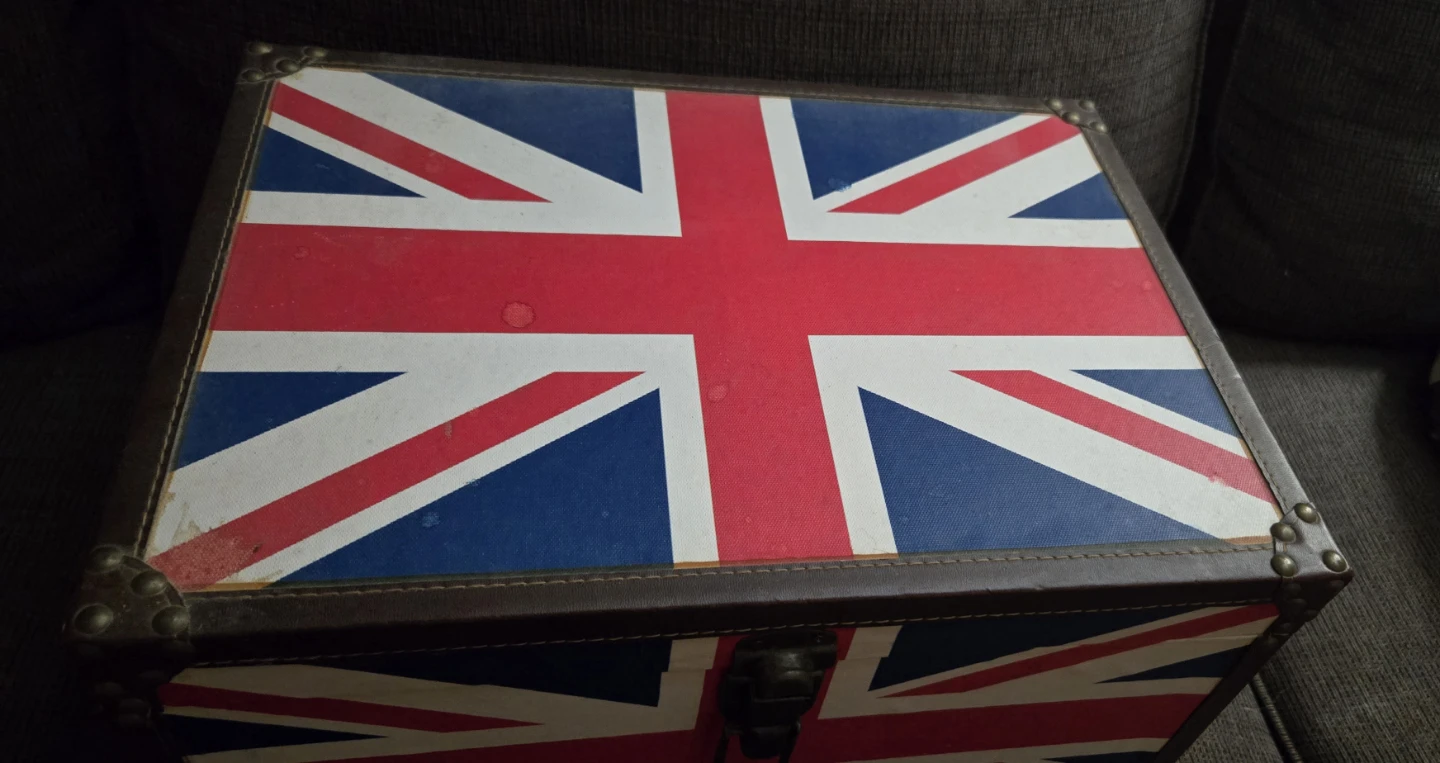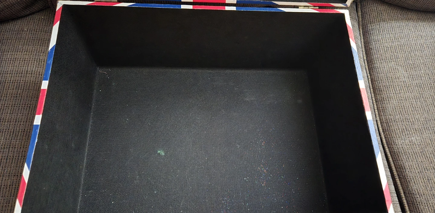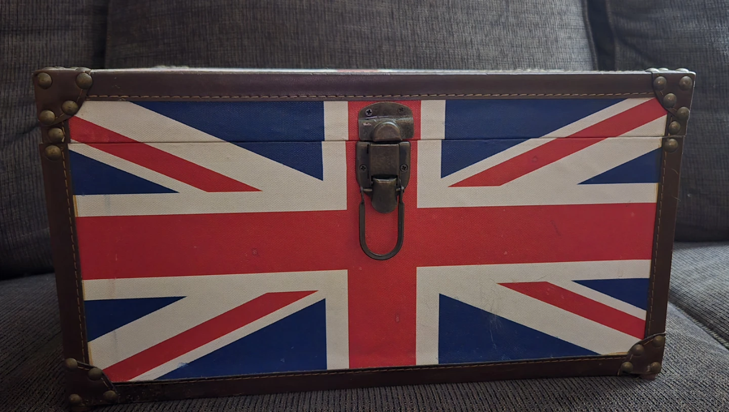 This is a decorative storage box featuring the Union Jack design. It's made with a sturdy construction and has a metal latch closure. The inside is lined with black fabric. This box is great for storing keepsakes or as a stylish decorative piece.