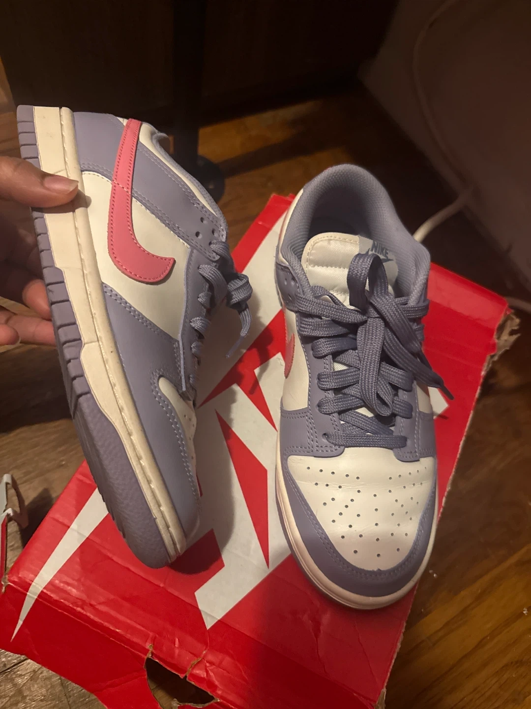 Selling a pair of Nike Dunk Lows in the Indigo Haze colorway, designed for women. They are in good condition and come with the original box. These stylish sneakers are perfect for adding a pop of color to your wardrobe!