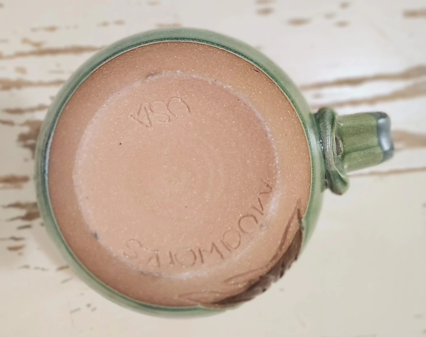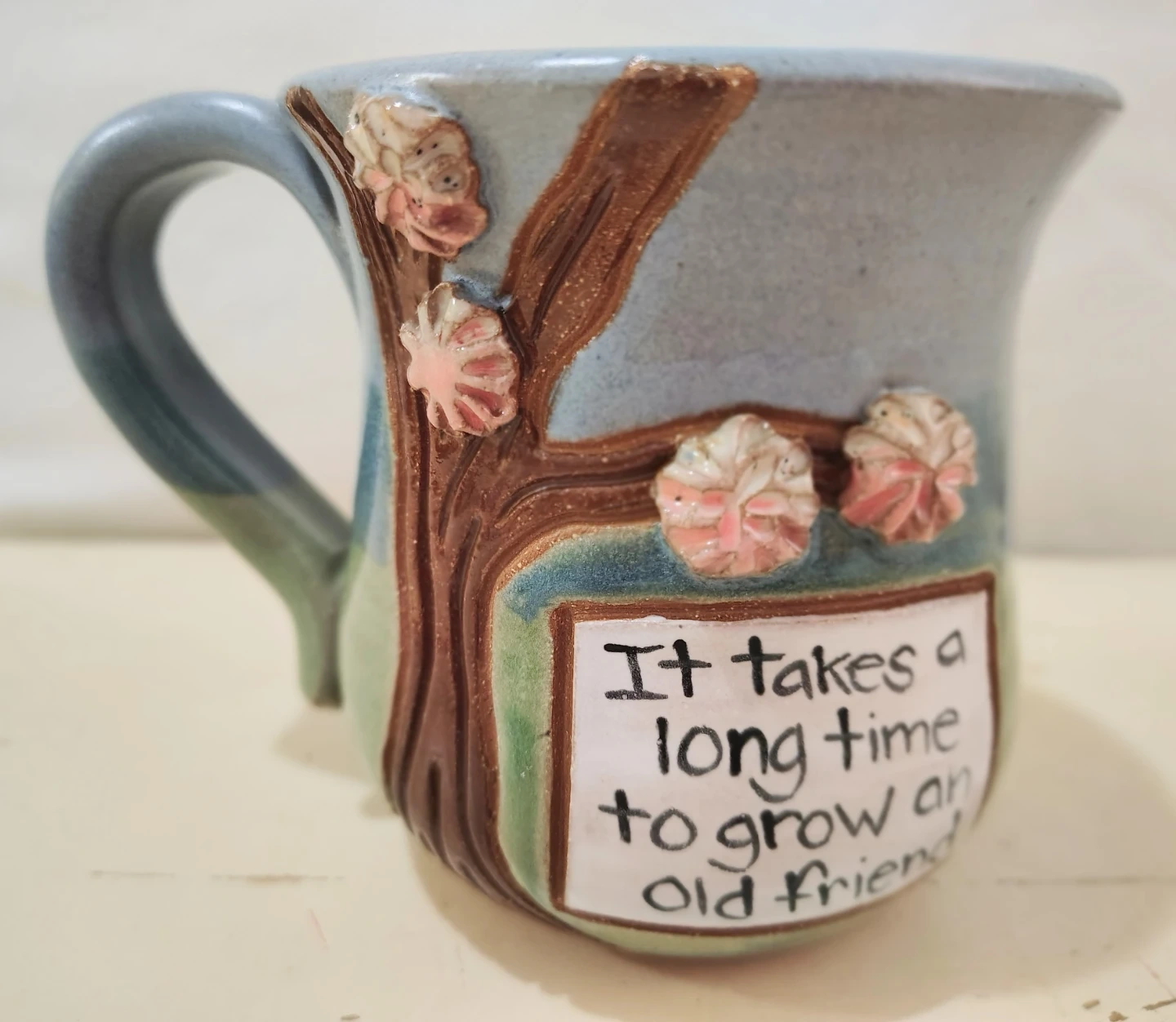 Uncommon goods hand made/painted 14 oz. stonewear clay mug (lead free glaze). Cherry blossoms sprout from base. "It takes a long time to grow an old friend' 14 oz. Artist JoAnn Stratakos orig. $48, Microwave/dishwasher safe.
