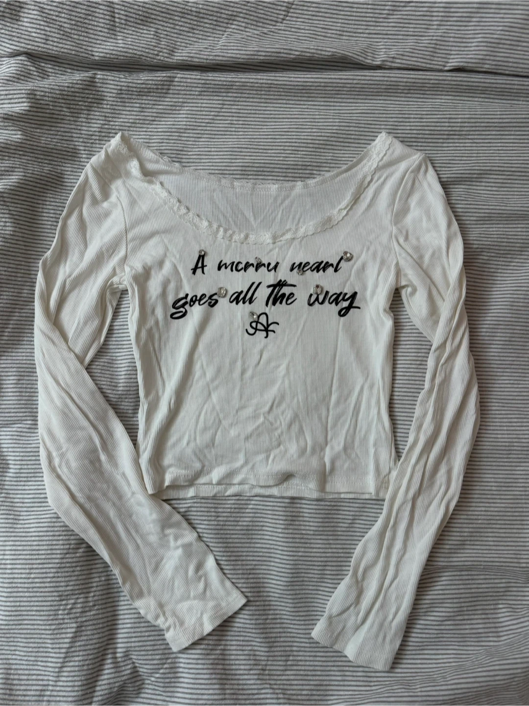 White long-sleeve top with a ribbed texture. It features the phrase "A merry heart goes all the way" printed on the front, accented with rhinestones. This top has a wide neckline and a fitted silhouette.