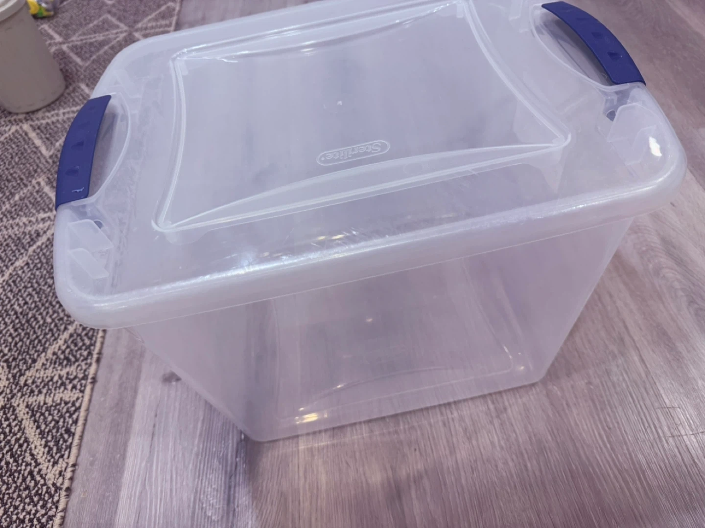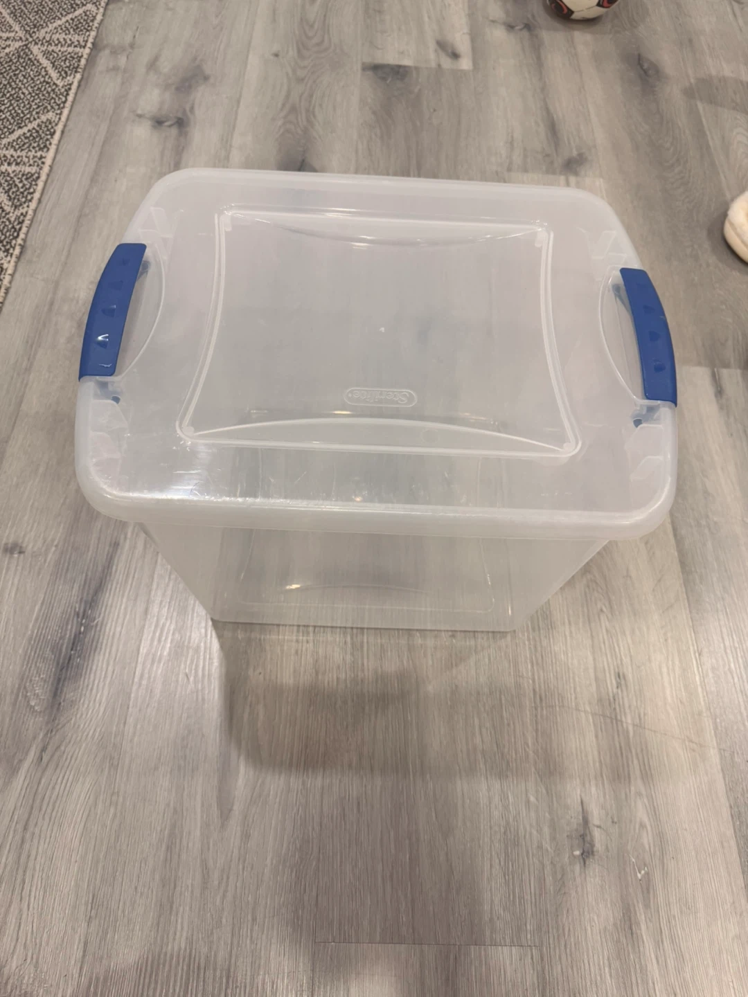 Sterilite 27 Qt storage bin with blue handles. Dimensions are 16.5" L x 13" W x 12.25" H. Made in Canada. This bin is great for organizing household items.