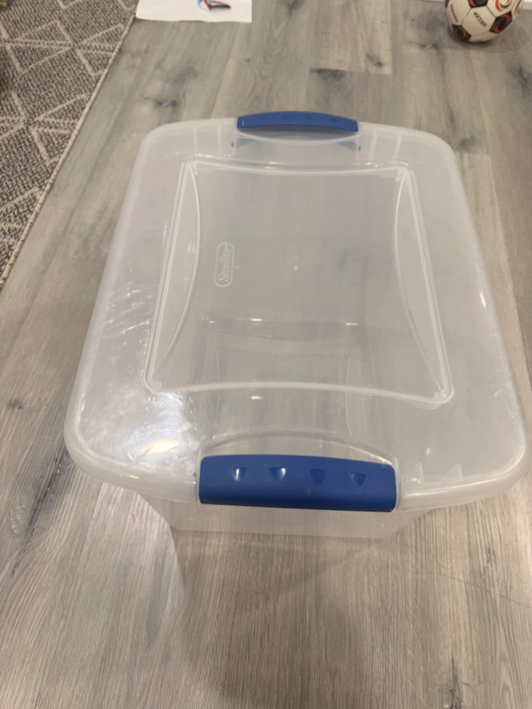 Sterilite 27 Qt storage bin with blue handles. Dimensions are 16.5" L x 13" W x 12.25" H. Made in Canada. This bin is great for organizing household items.