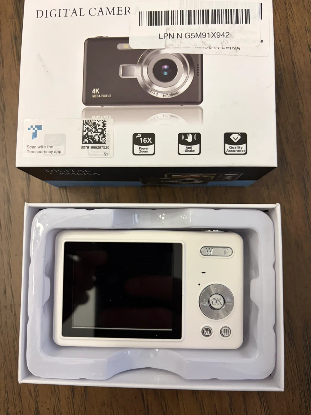 This is a digital camera with 4K resolution and 16x optical zoom. It includes a USB cable, wrist strap, 32GB SD card, and user manual. It also features anti-shake technology and face detection.